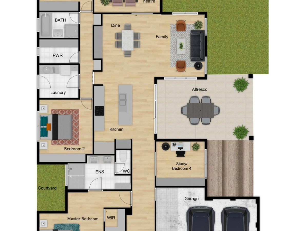 - Lounge/theatre room located to the rear of the home with French double door entry