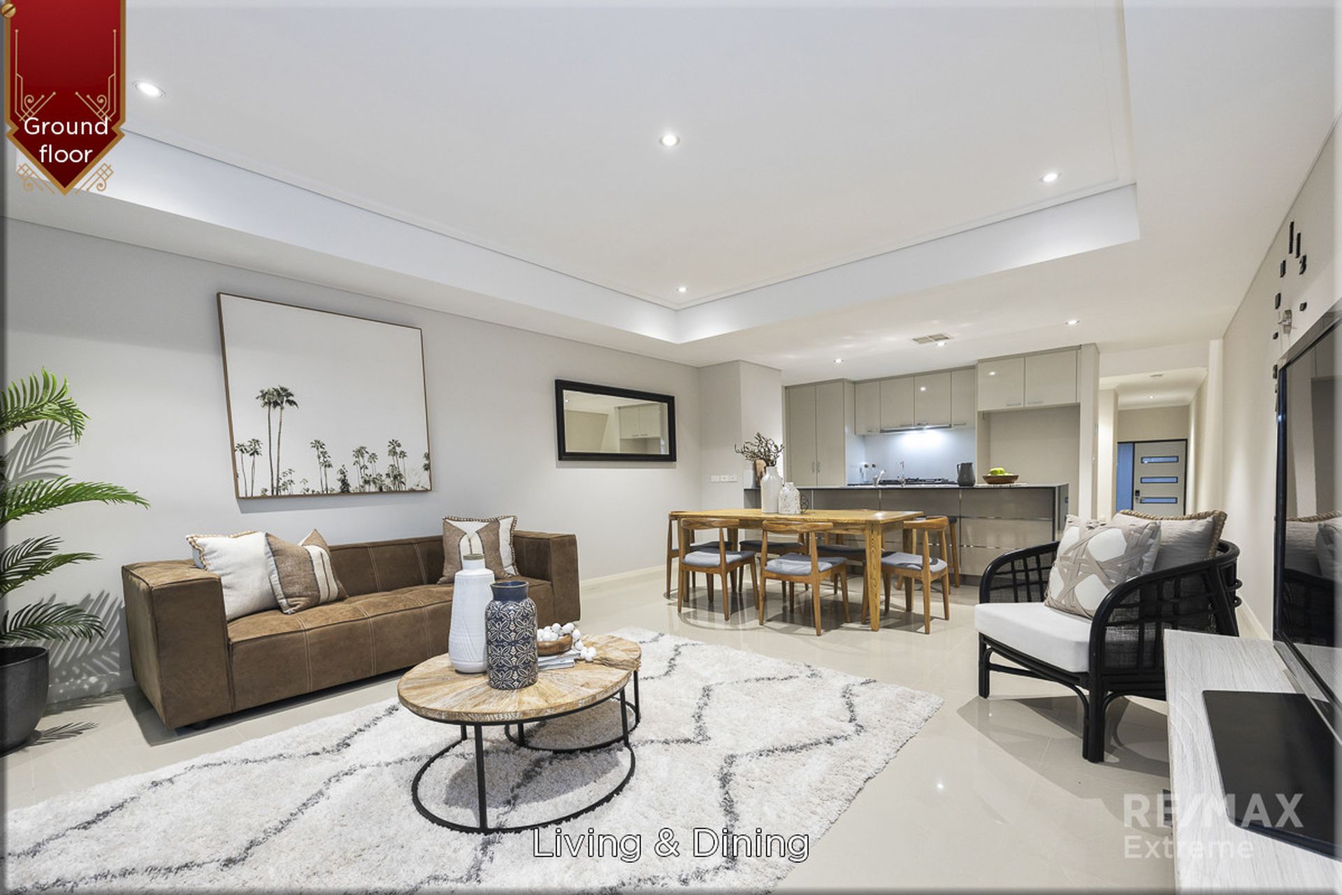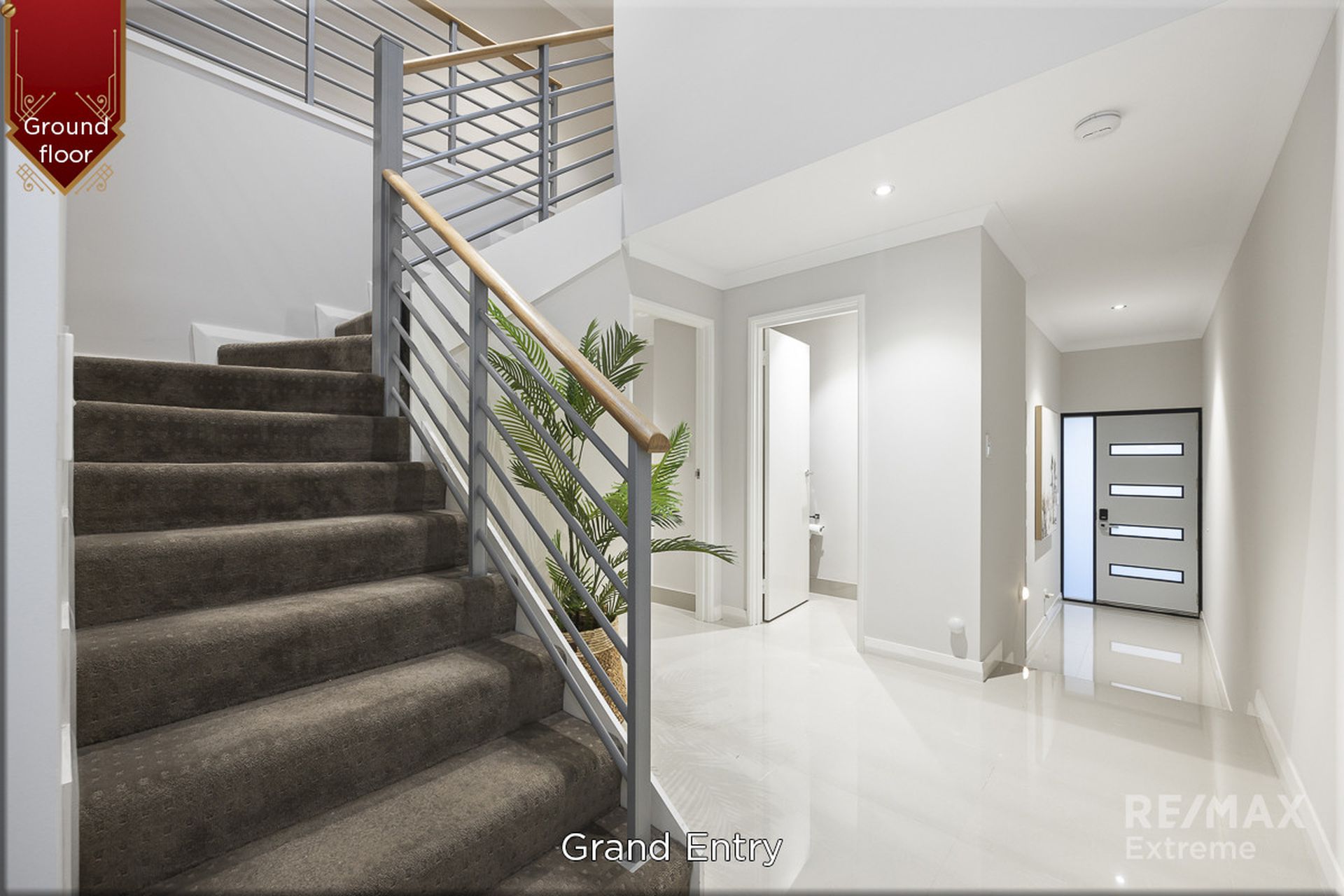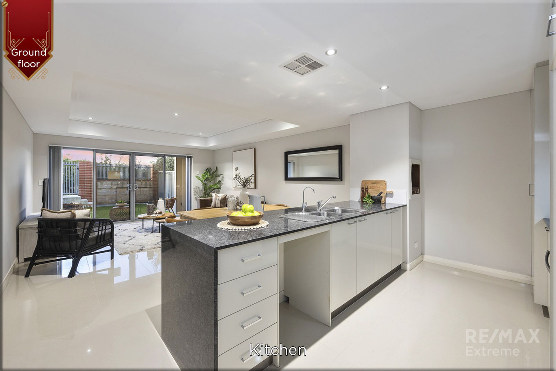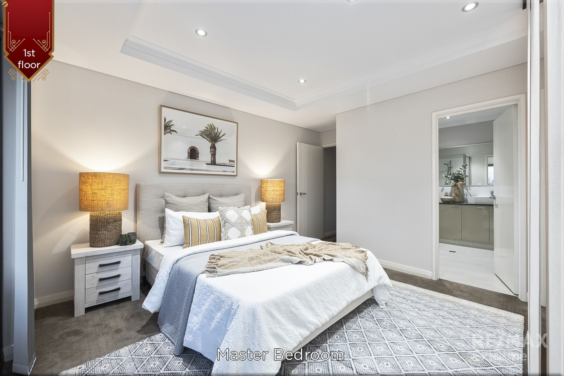 Opening to lofty high ceilings, a fresh neutral colour palette and tiles underfoot, this sleek & stylish home has been impeccably finished and offers a sense of grandeur from the moment you enter the property. On the ground floor, the living & dining area boasts recessed ceilings with plenty of natural light and gives you a calm relaxing place to unwind after a busy day. The kitchen is clean and modern with waterfall stone benchtops, 900mm appliances + rangehood, overhead storage, double pantry, double fridge recess, dishwasher recess, and a hidden microwave shelf.