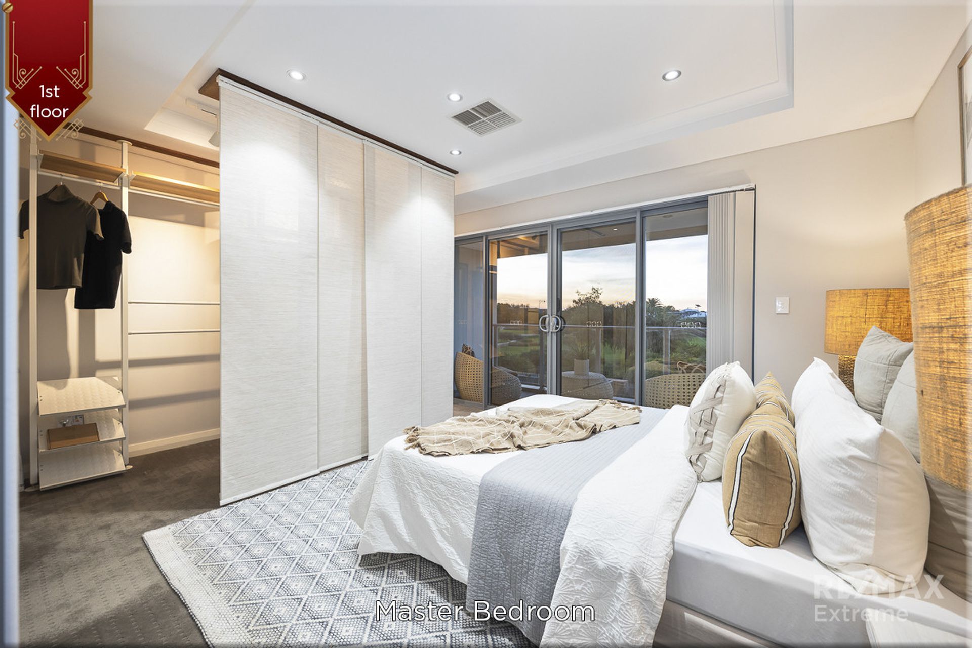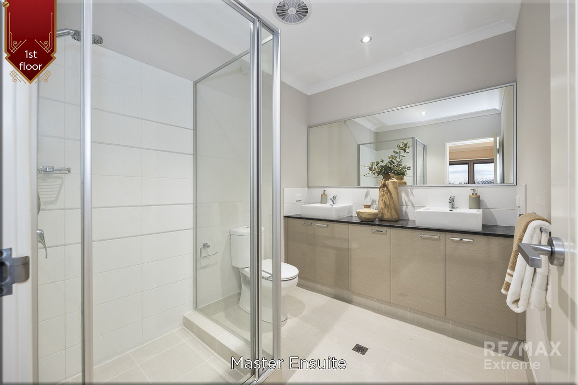 Located on the second storey, the master bedroom is sure to draw your attention! Waking up to lush green views of the local park sets your mood for a day of success. Presented with recessed ceilings, sliding door access to the balcony, a large walk-in robe (for him) and masses of extra clothes storage hidden behind roman blinds (for her); the generous ensuite comes complete with stone benchtops, his and hers dual vanities, glass-door shower, and toilet.