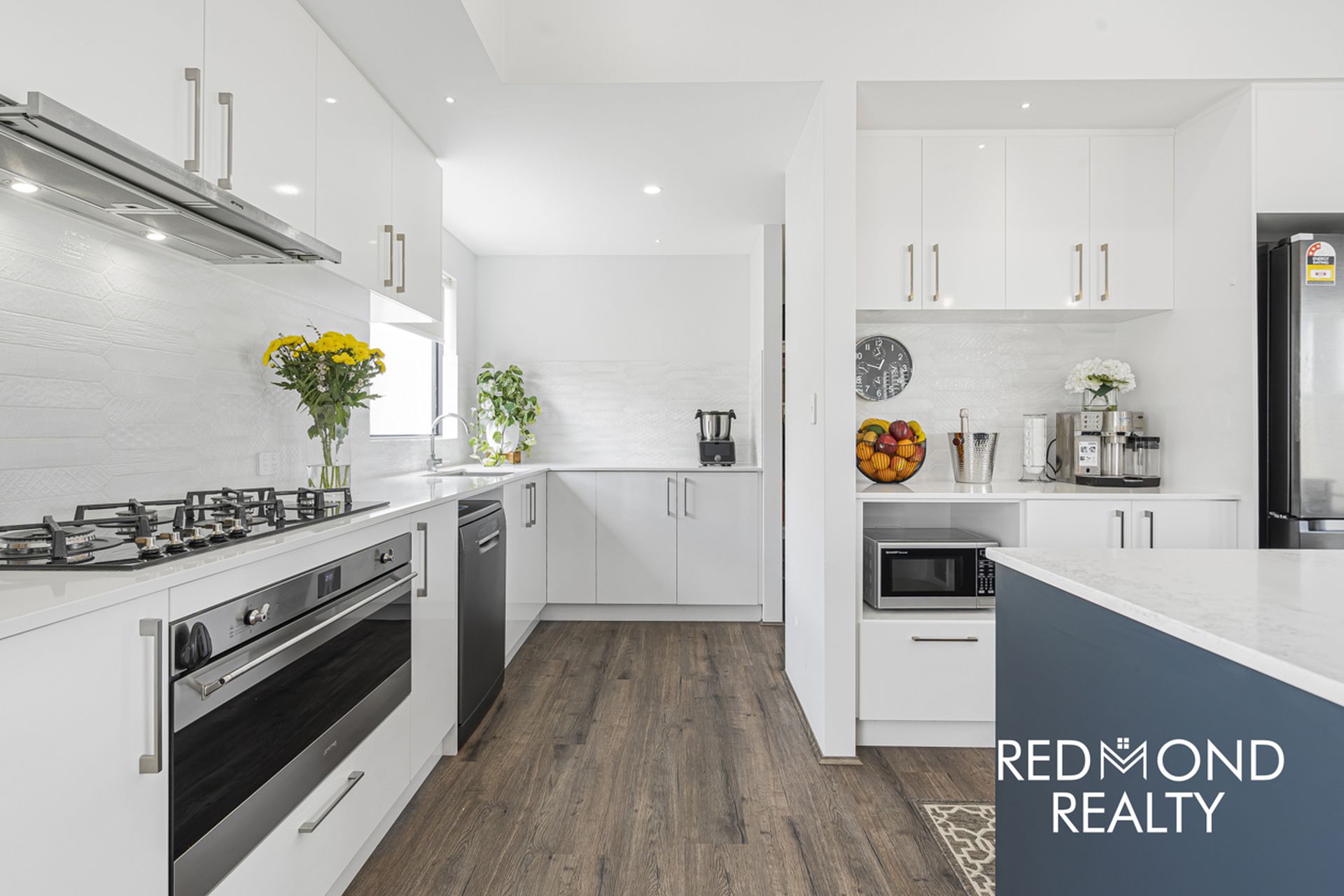 - Create some culinary feasts in the beautifully appointed kitchen with gleaming engineered stone benchtops, Smeg cooking appliances, an abundance of ‘cool-white’ cabinetry, centre island with contrasting cupboards, large Scullery with walk-in pantry, Bosch dishwasher, 90cm under-bench oven, gas cooktop, under-mount extractor, plumbed fridge recess, exquisite white tiling to the splashbacks