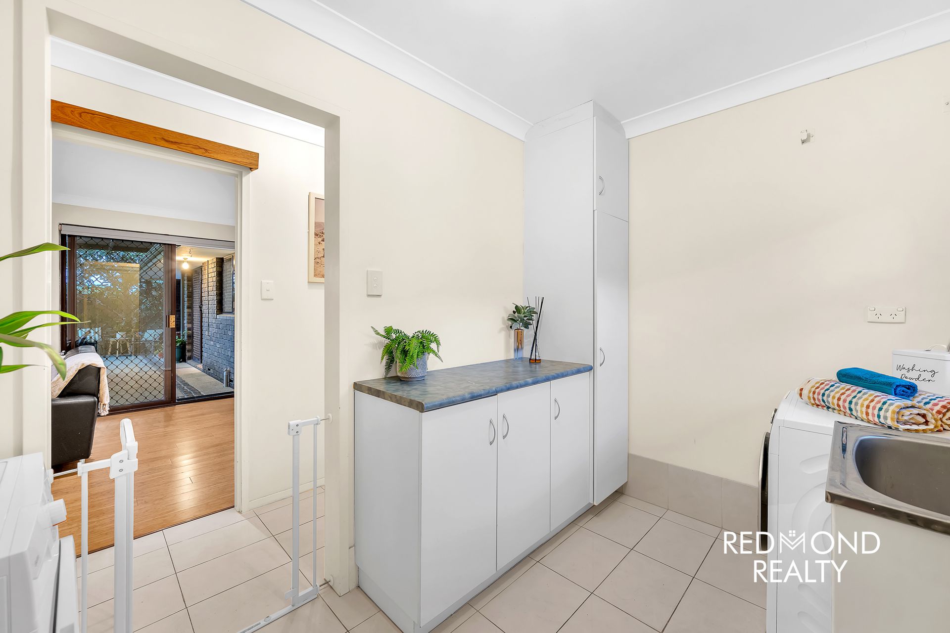 The laundry is larger than most and perfectly positioned on the floorplan to convert part (or all) of it into a second full bathroom, leaving the current bathroom as a private ensuite for the primary.