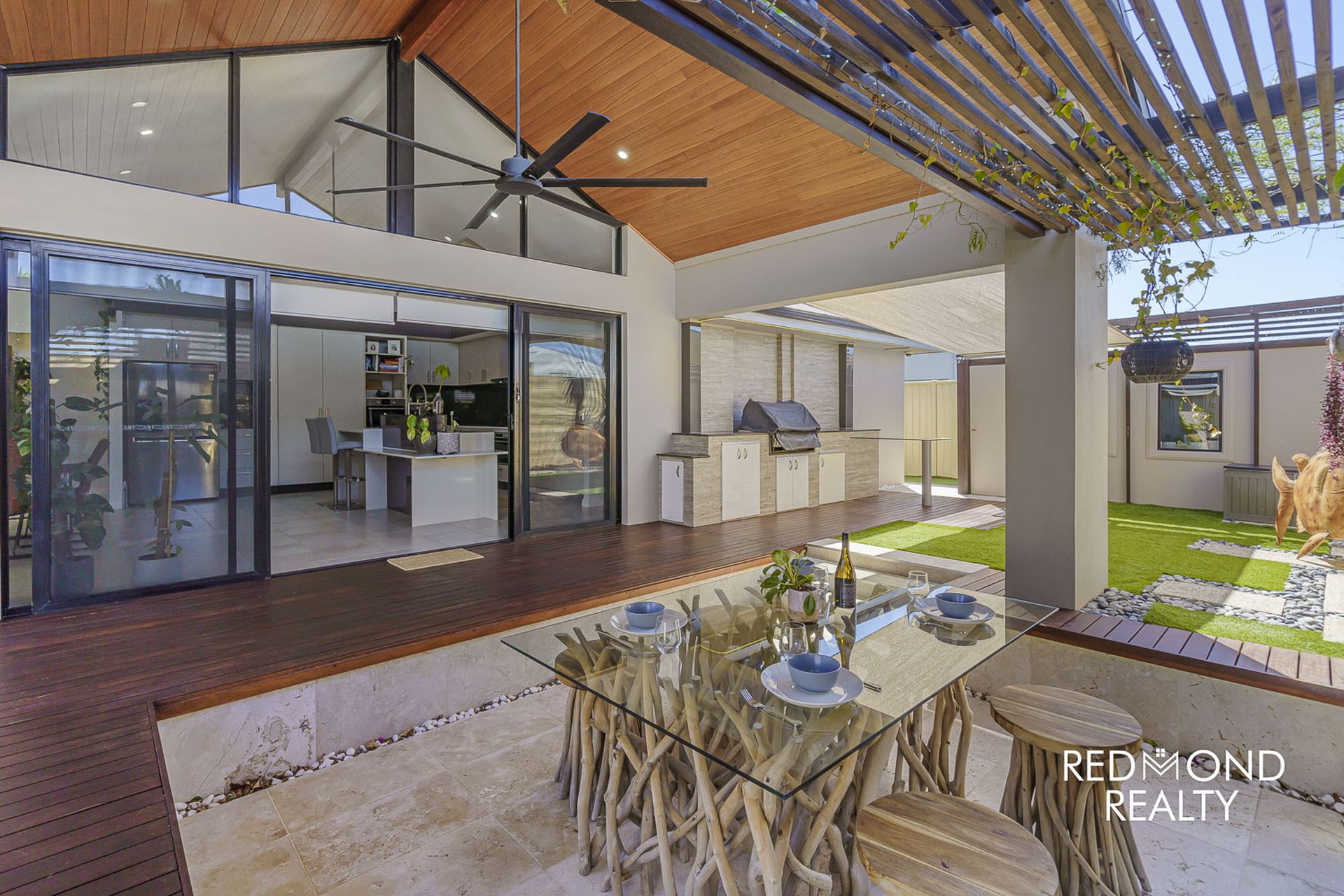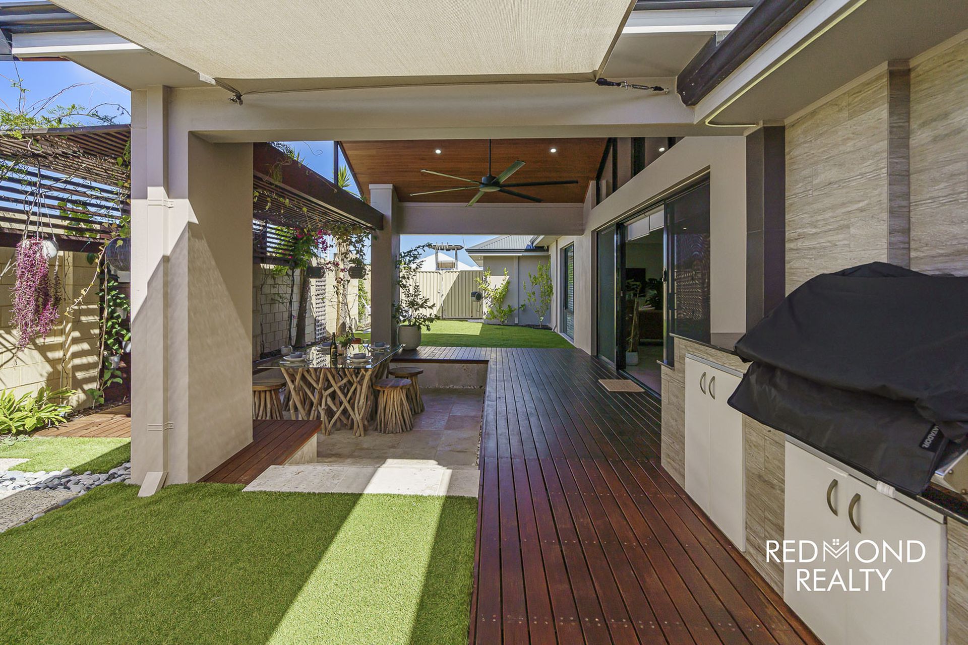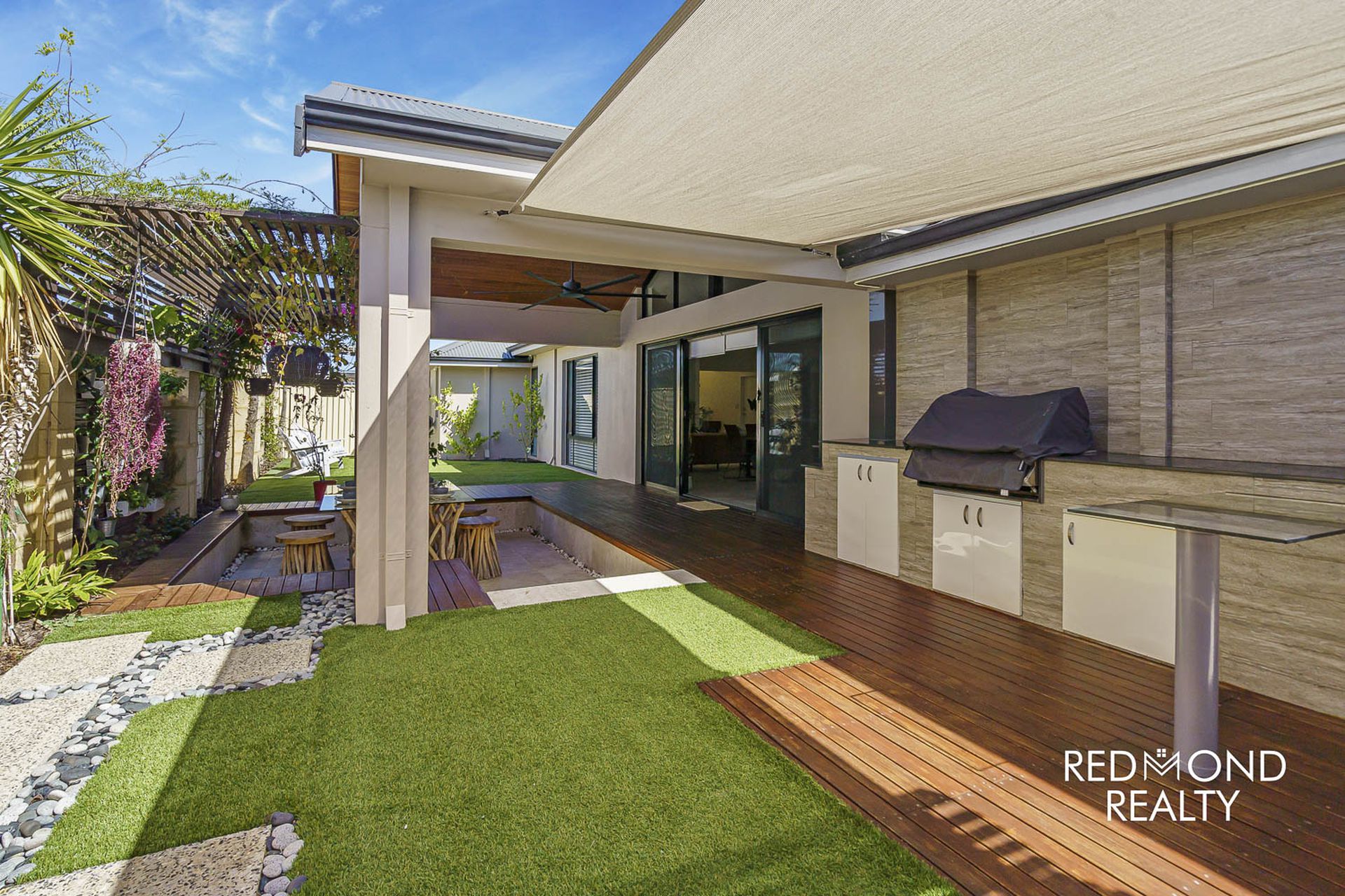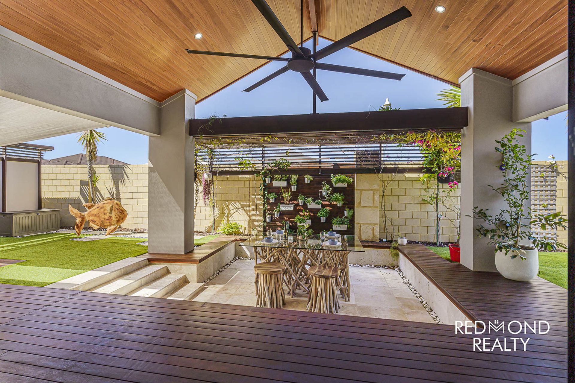 Love to entertain… sublime outdoor Alfresco with high Cedar lined gabled ceiling, real timber decking, oversized ceiling fan, superb sunken area with Travertine stone, in-built BBQ with storage cabinetry, beautifully set amongst immaculately maintained gardens with space galore for children and pets to freely play.