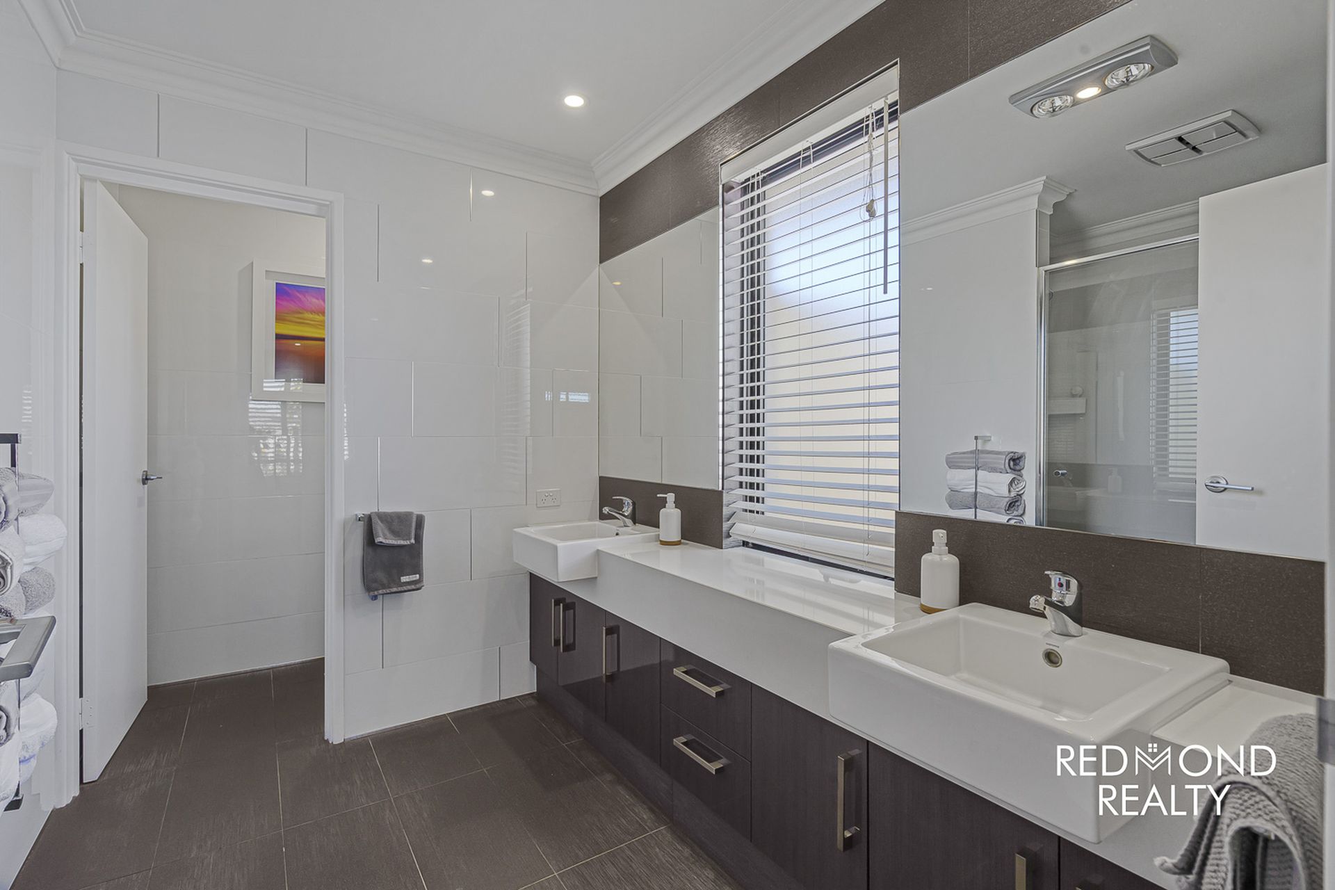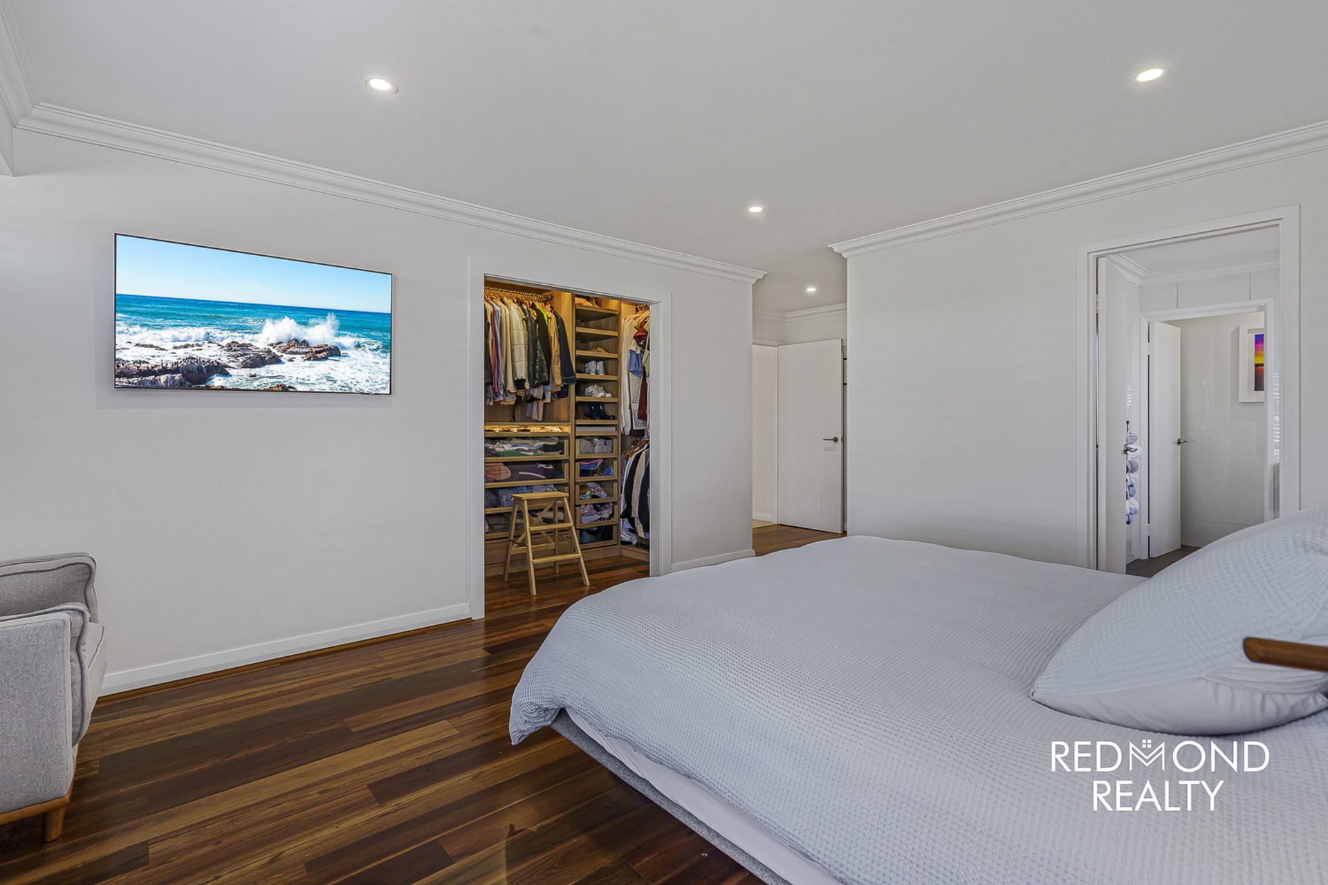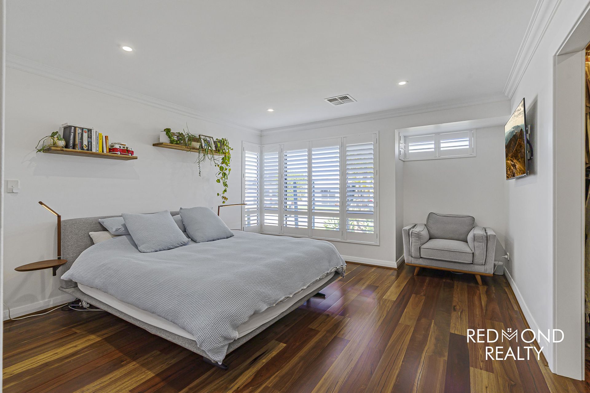 - Elegant & tranquil Master bedroom suite with Spotted Gum floors, double entry doors, large fully fitted walk in wardrobe, fabulous ensuite bathroom with floor to ceiling tiling, dual vanity, double shower & separate WC