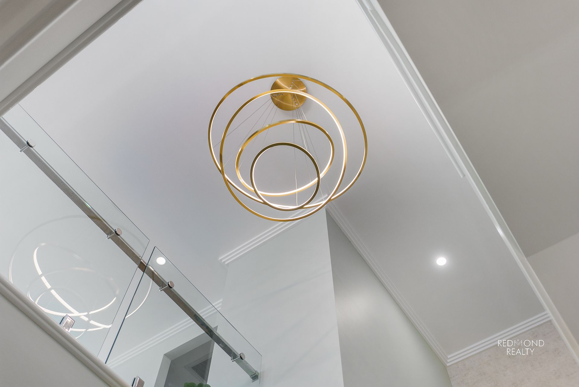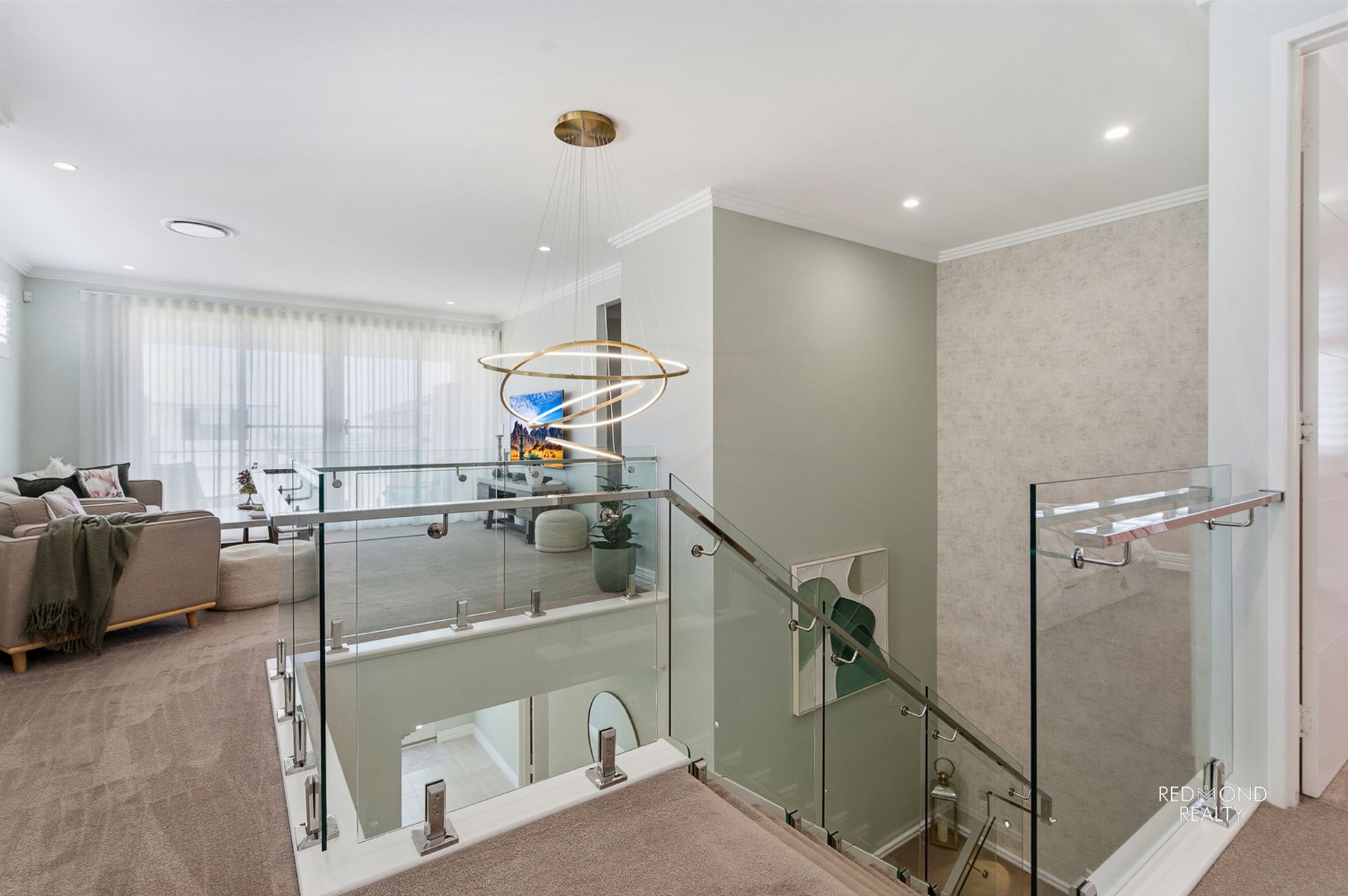 - Wide and curving staircase, glass & stainless steel balustrading, soaring ceiling with stunning feature pendant light