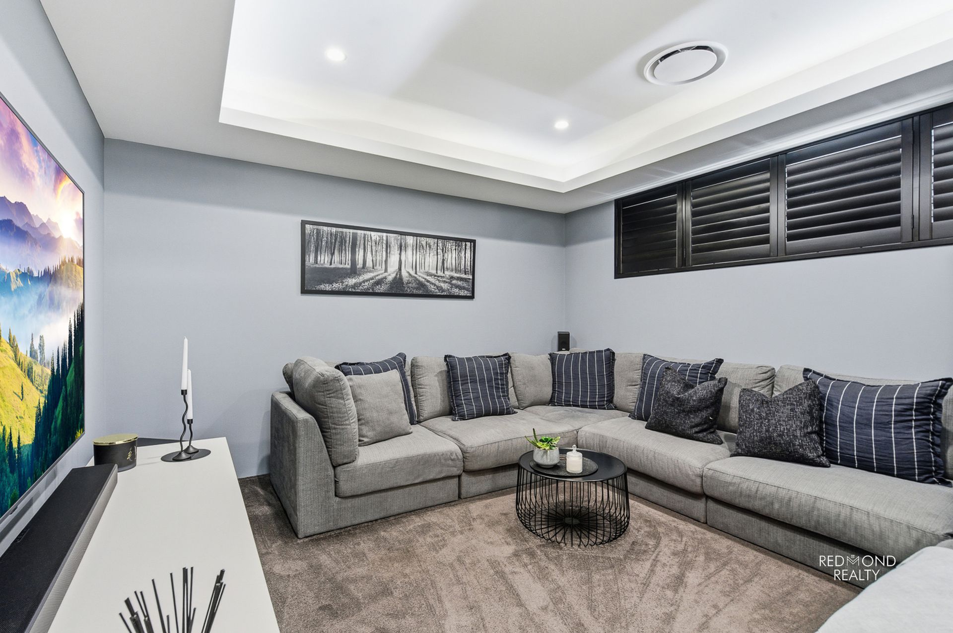 - Brilliant theatre room with double door entry, high recessed ceiling