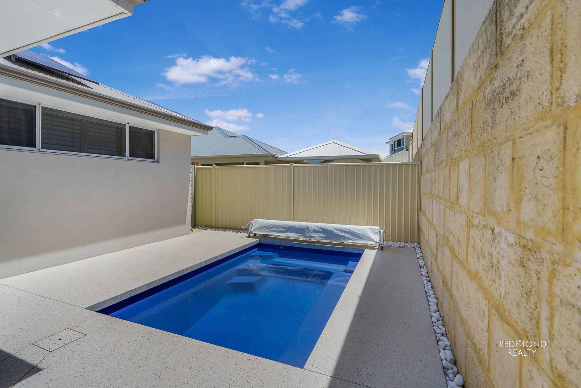- Sun-soaked, heated fibreglass pool with spa jets and seating