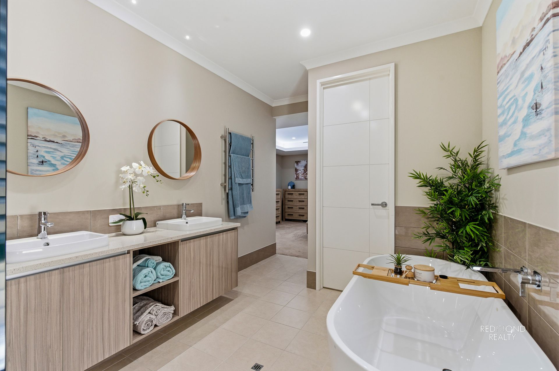 - Beautiful Master bedroom suite with feature wallpaper, high recessed ceiling, huge walk-in wardrobe, stunning ensuite bathroom with dual vanities, over-sized hobless shower, freestanding oval bathtub for an additional splash of glamour, separate WC