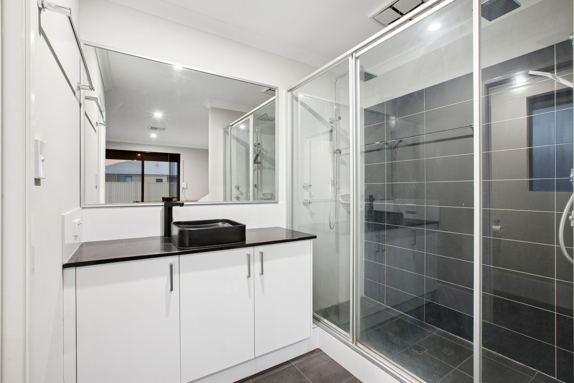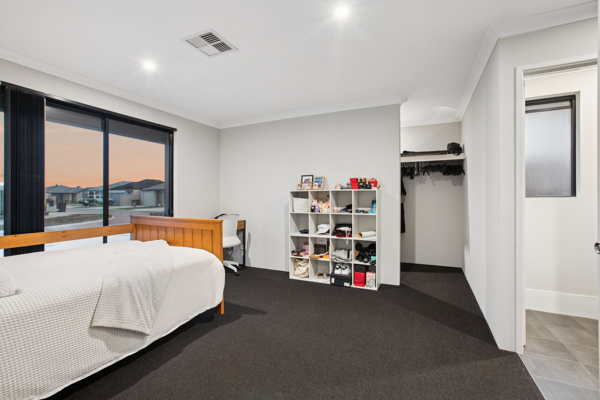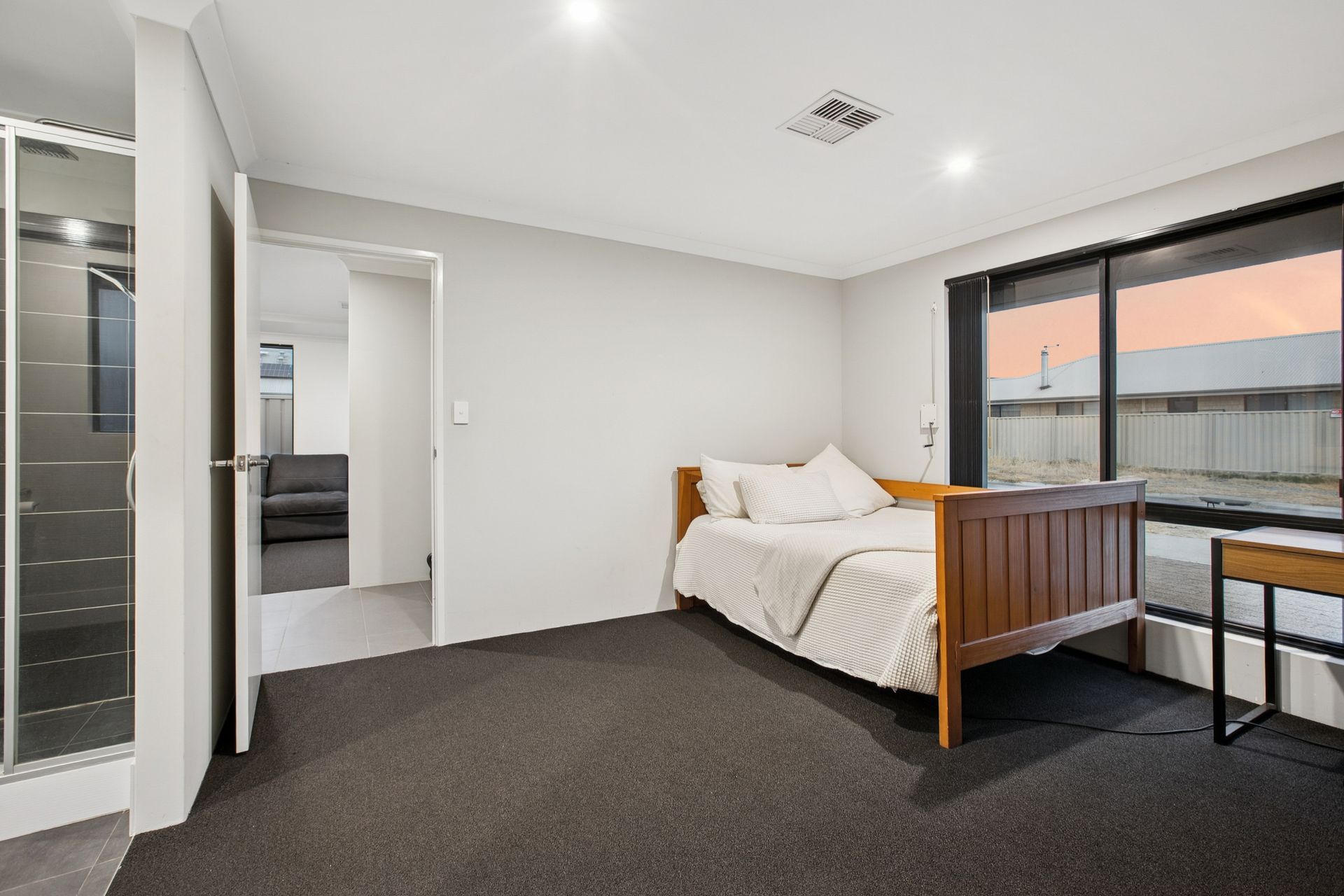 - A large carpeted master-bedroom suite that is the pick of the sleeping quarters with its large walk in robe, security shutters & private ensuite bathroom, vanity, dual-shower and all.