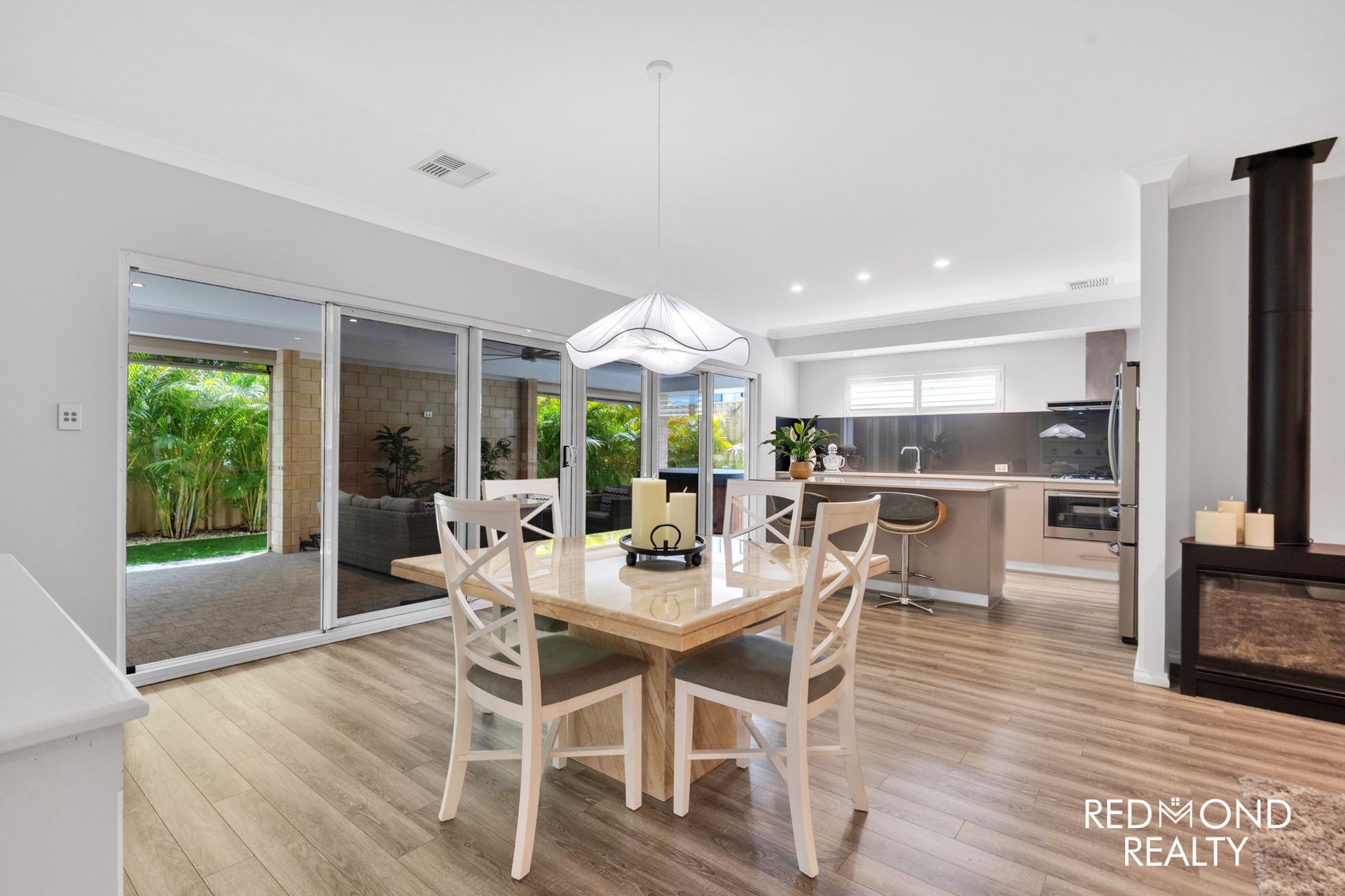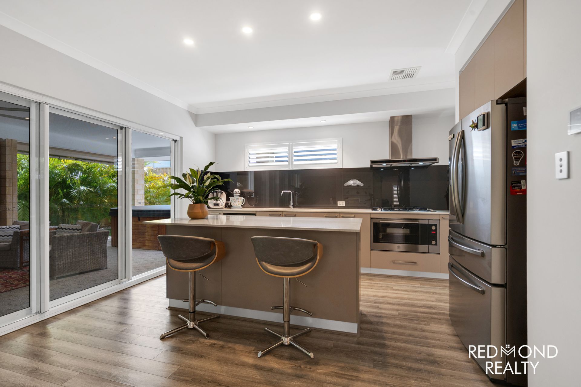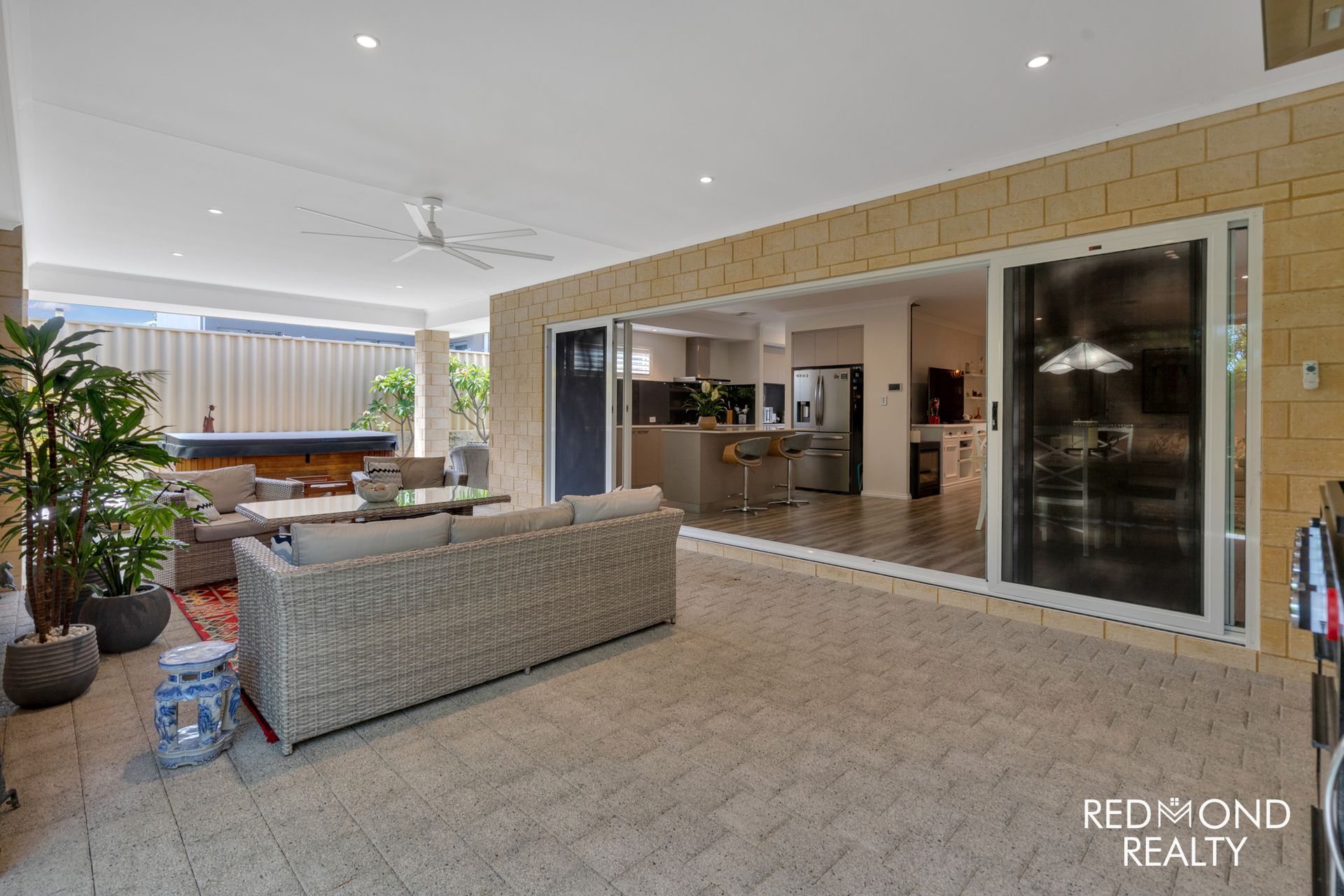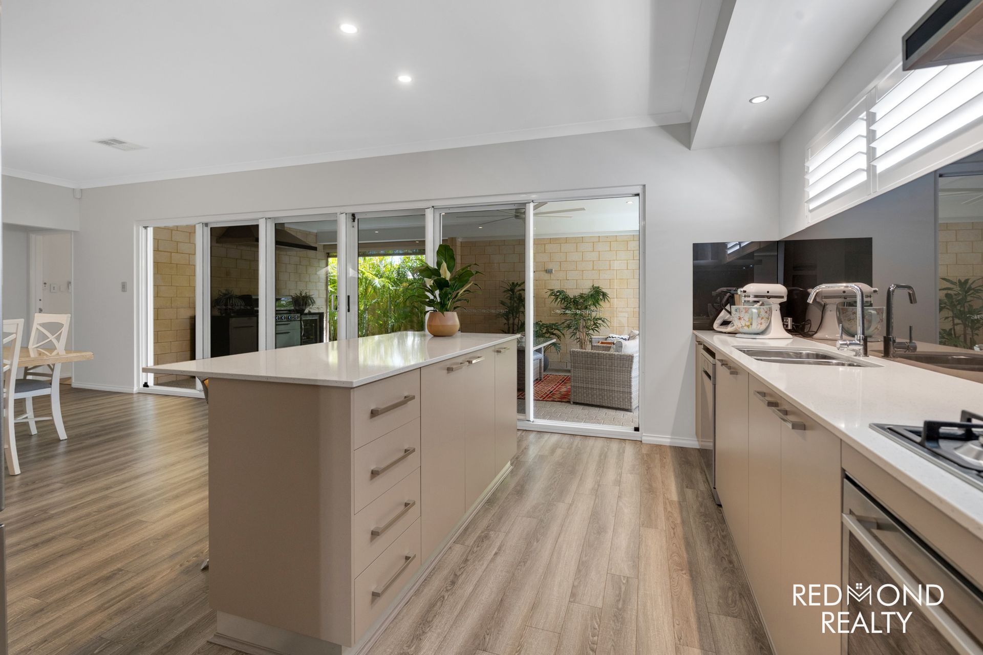 - Grand central living area dappled in natural sunlight, wide triple stacker doors open to reveal the large, secluded outdoor Alfresco area comfortably blending indoor & outdoor living, weather-proof café blinds for year-round comfort