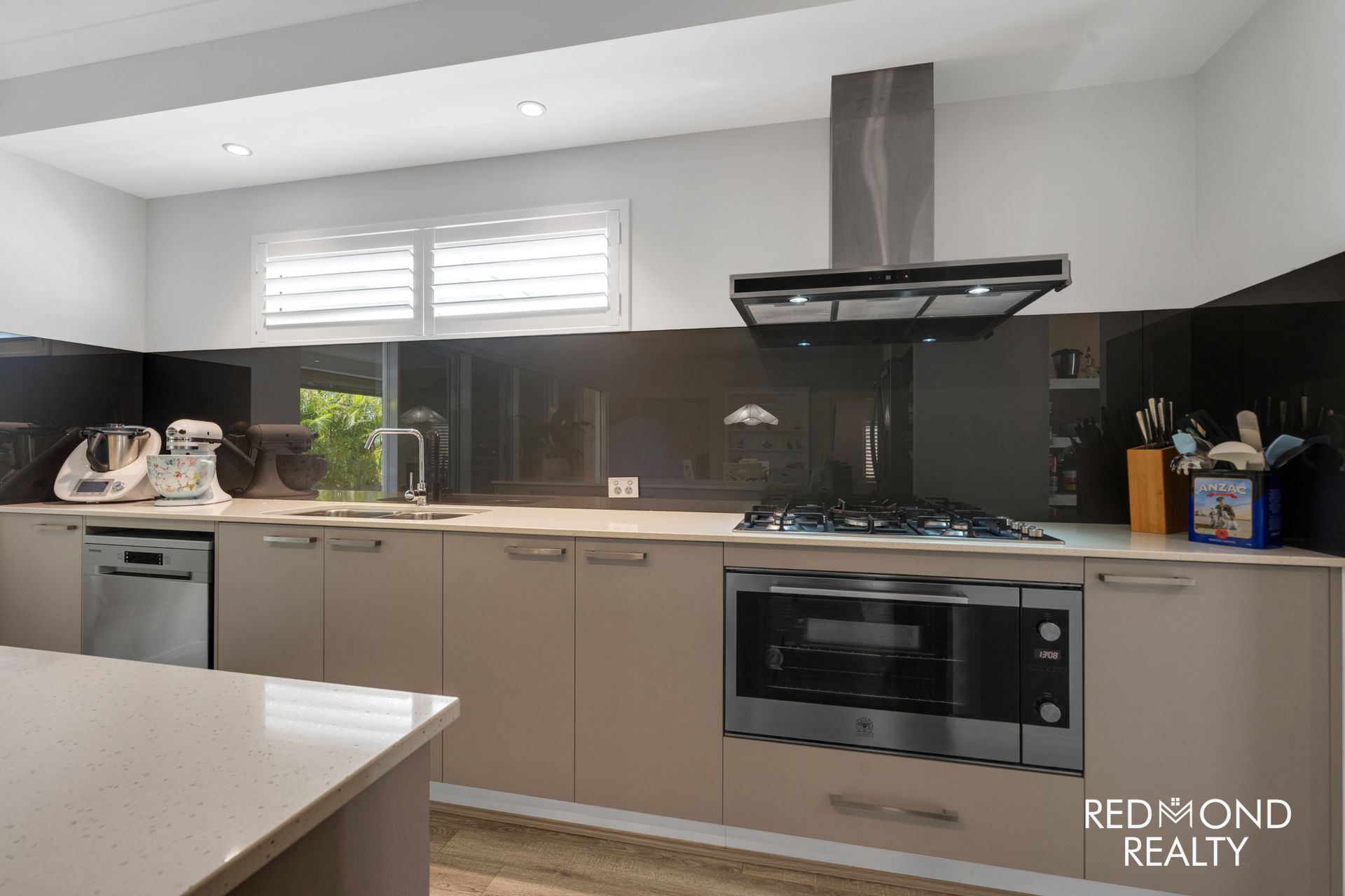 - Create some culinary delights in the wonderfully crafted kitchen; gleaming engineered stone benchtops, expansive centre island prep bench with convenient breakfast bar, full-size Scullery area, glass splashbacks, new Samsung dishwasher, overhead extractor, an abundance of cupboards, five burner gas cooktop, under-bench 90cm oven, plumbed fridge recess