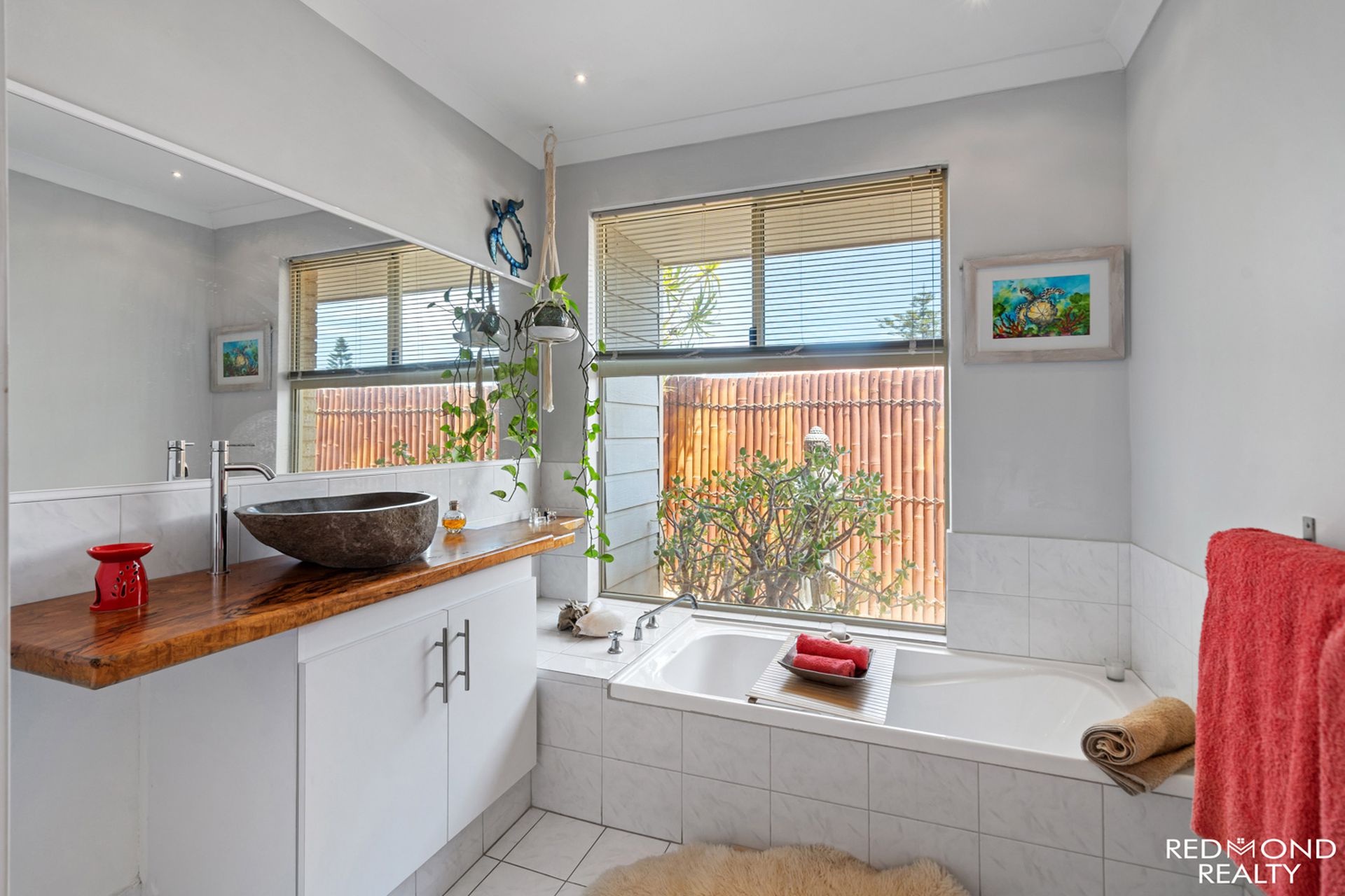 - Neat and spacious family bathroom; feature basin, bathtub, beautiful solid timber worktop