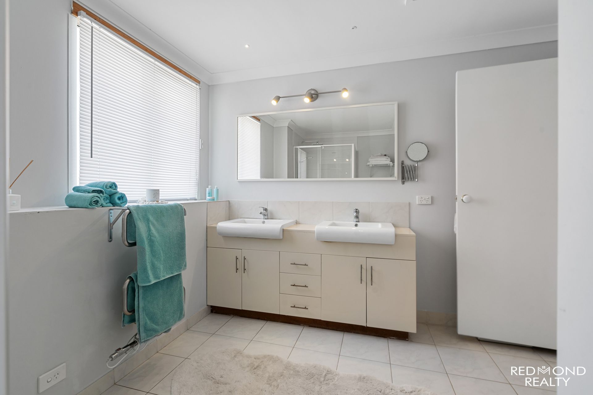 - Stylish bathroom with shower, dual vanity, separate WC