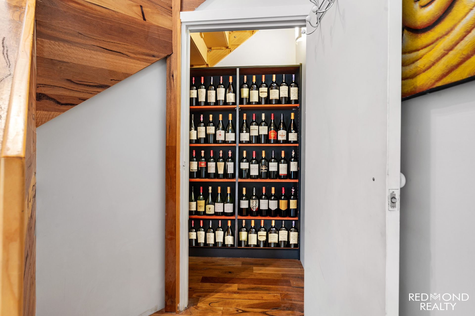 - Curving Marri timber staircase, under-stair storage
