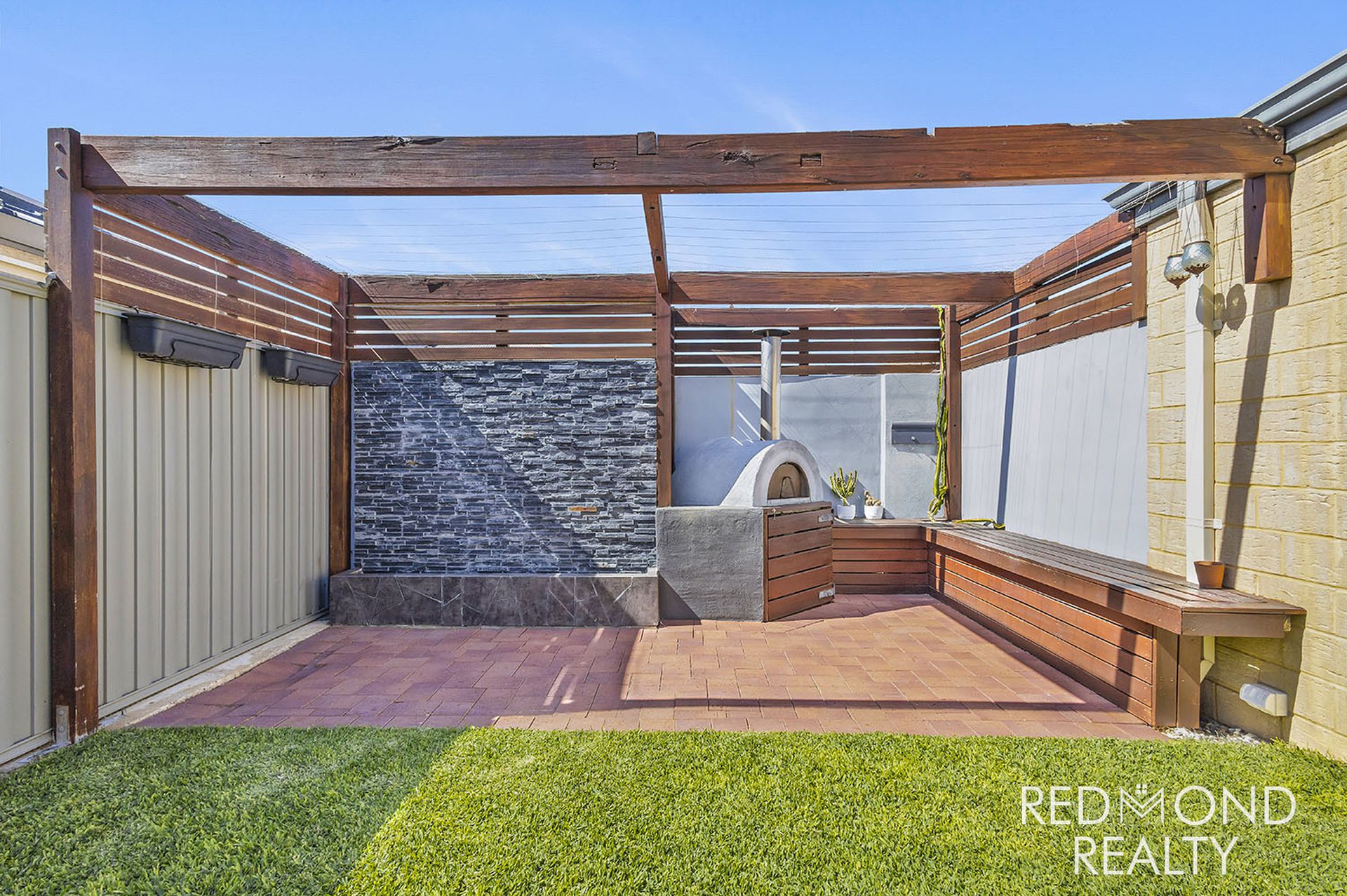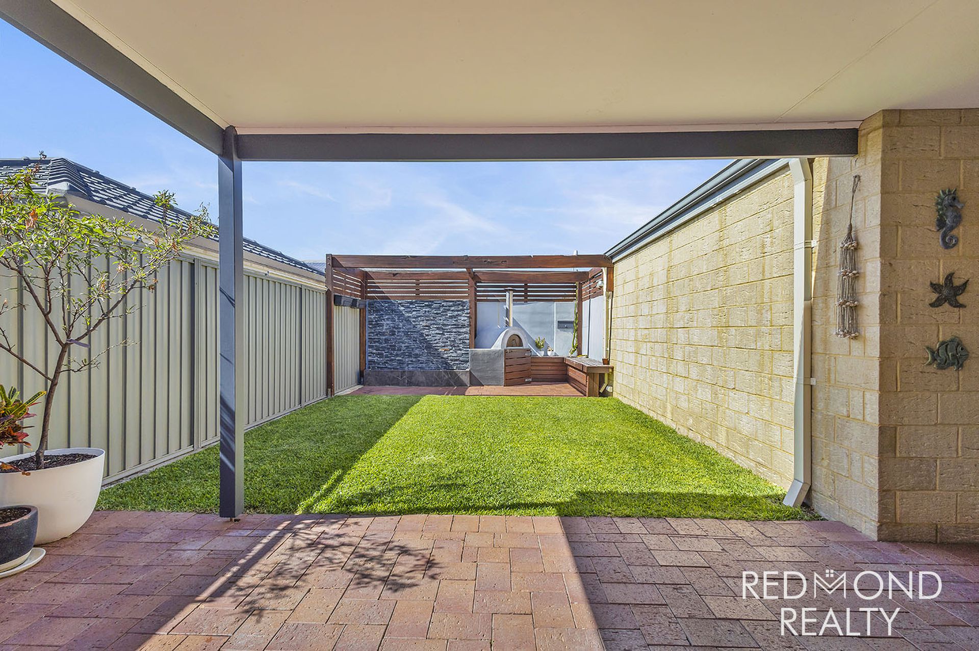 Private, low-maintenance backyard with outdoor pizza oven
