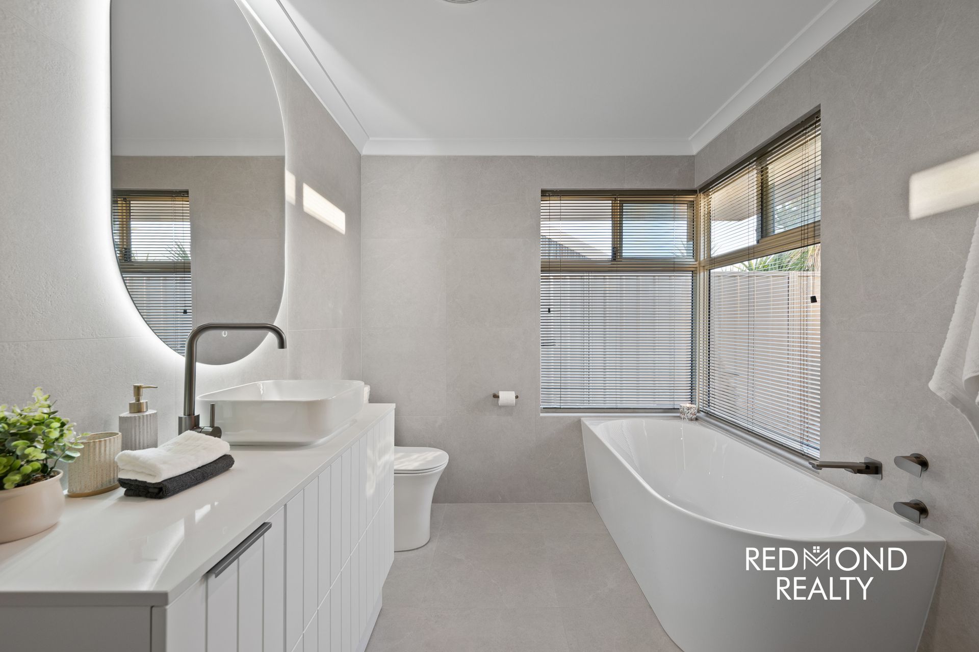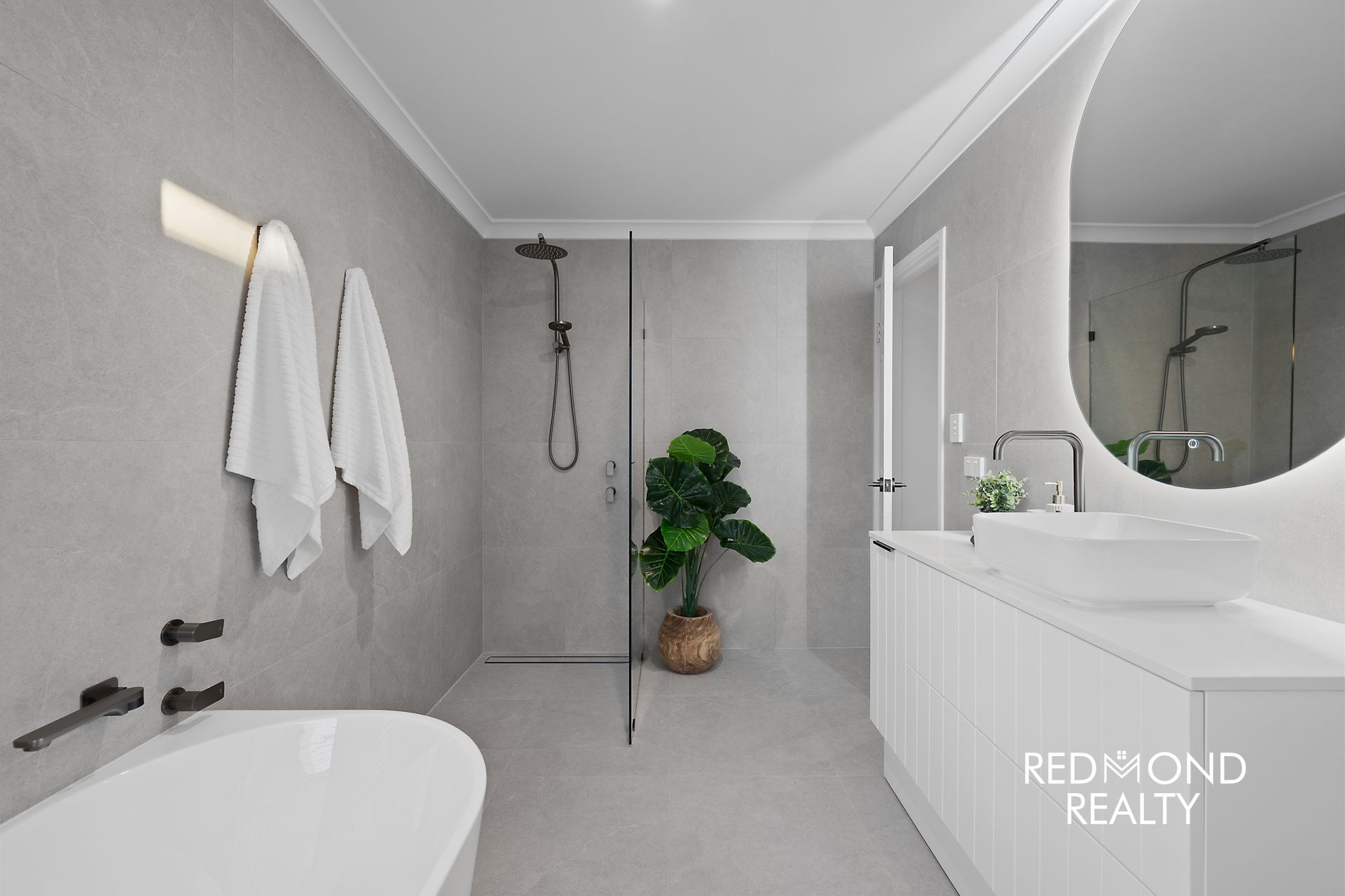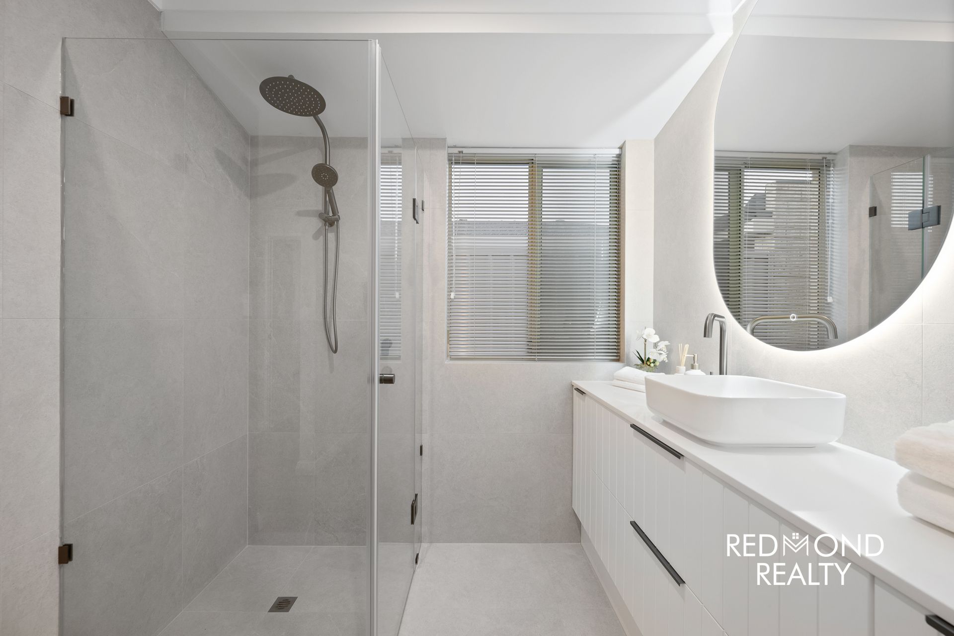 -Ensuite bathroom featuring floor-to-ceiling tiling, new shower, stone vanity, LED mirror and separate toilet