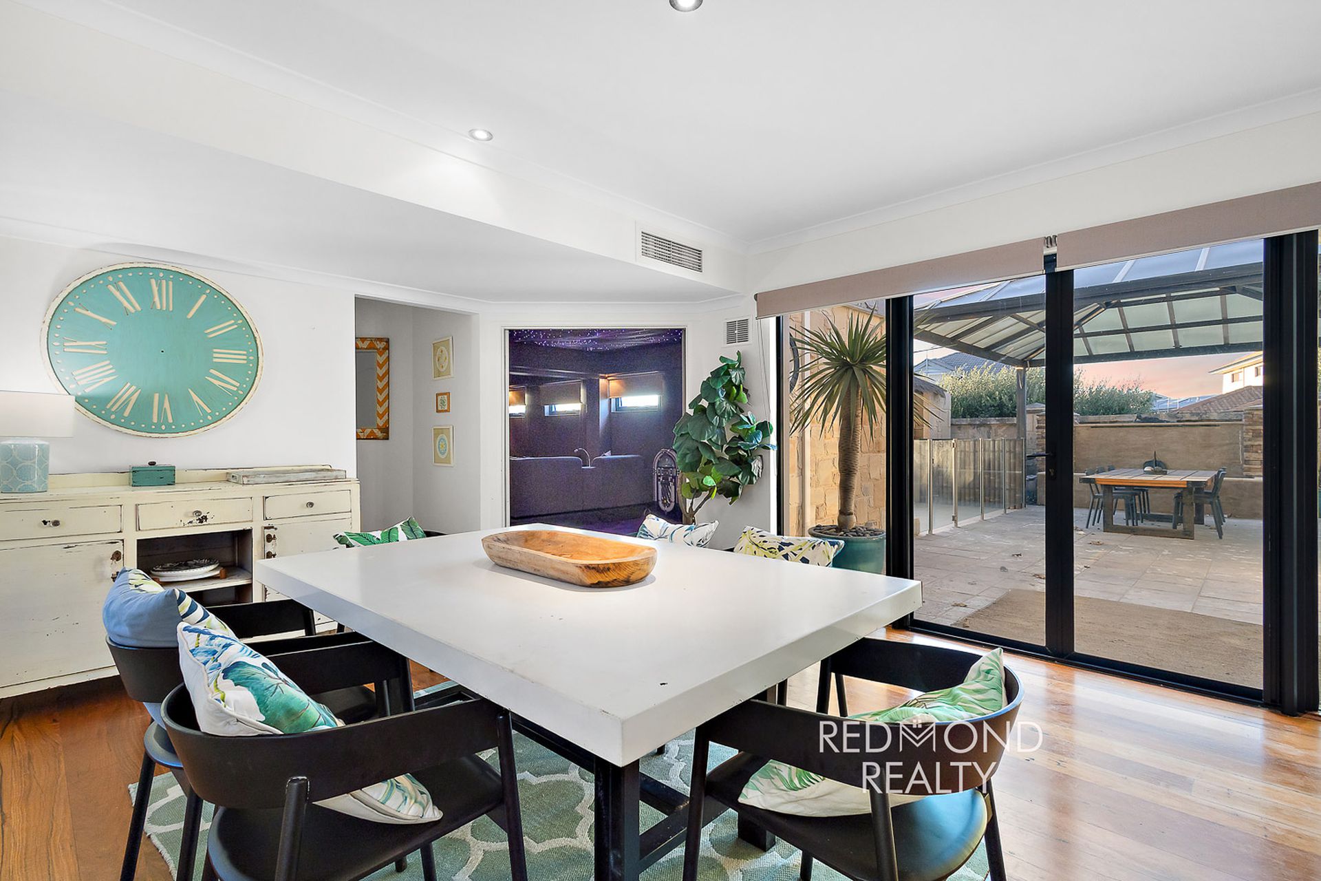 Modern open-plan kitchen & dining overlooking pool
