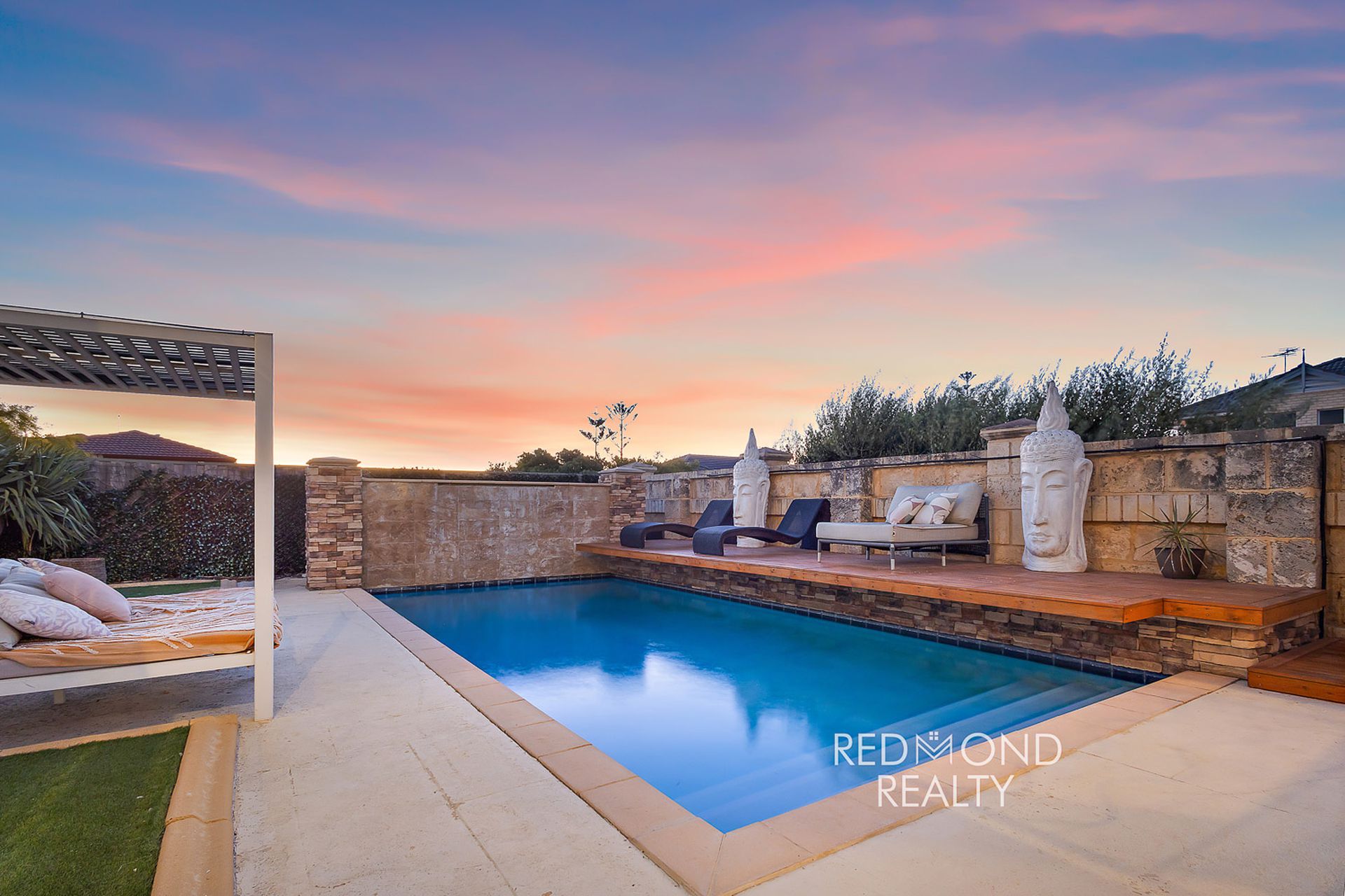 Low-maintenance artificial lawn & paving and beautiful deck by the swimming pool