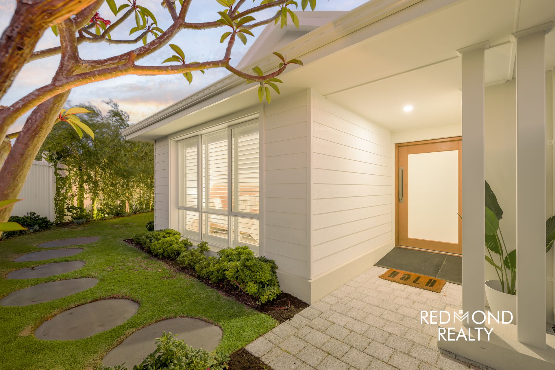 • Enclosed front yard with modern vertical slat fencing