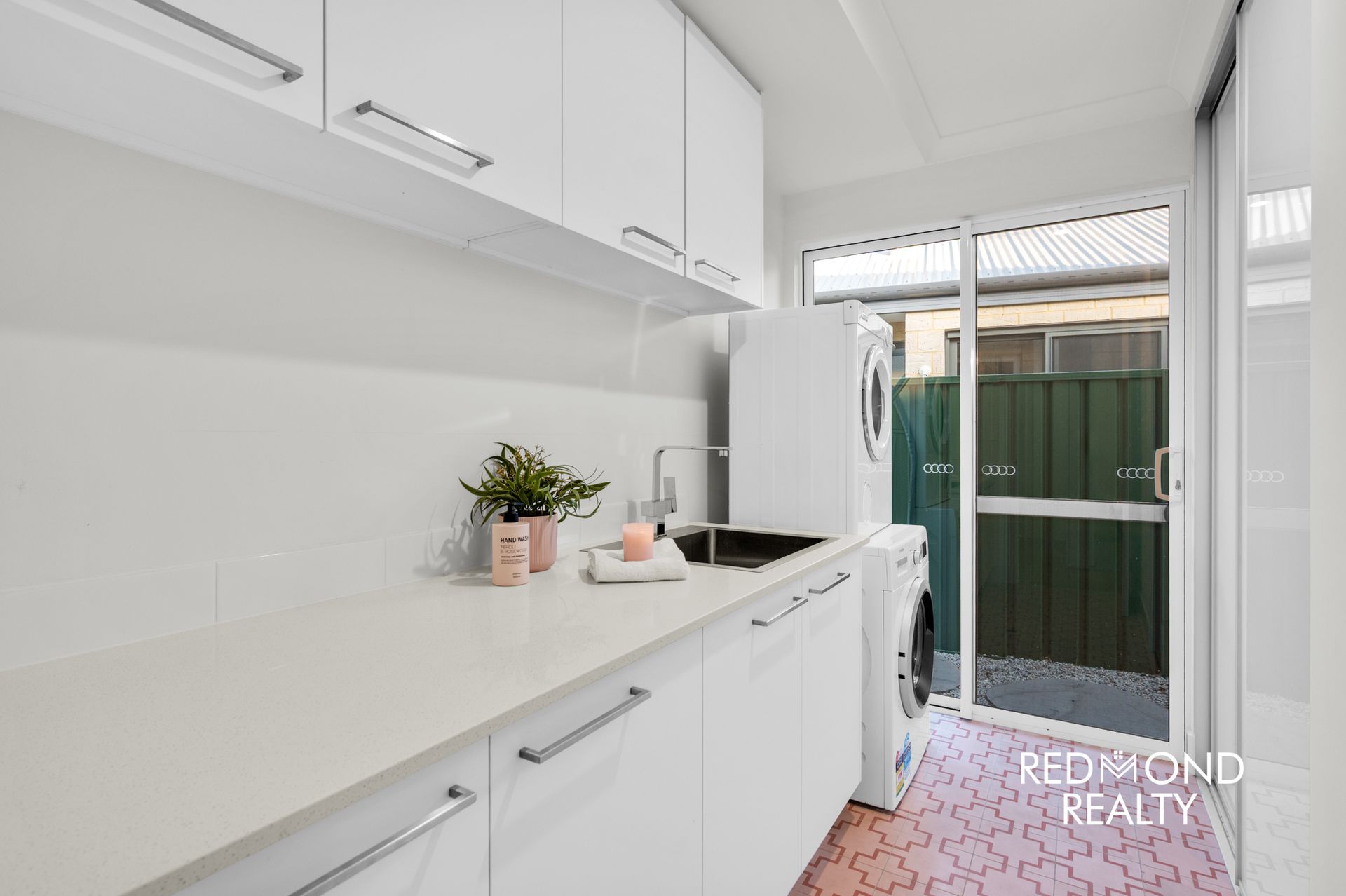 • Spacious laundry with extensive cabinetry and outdoor access