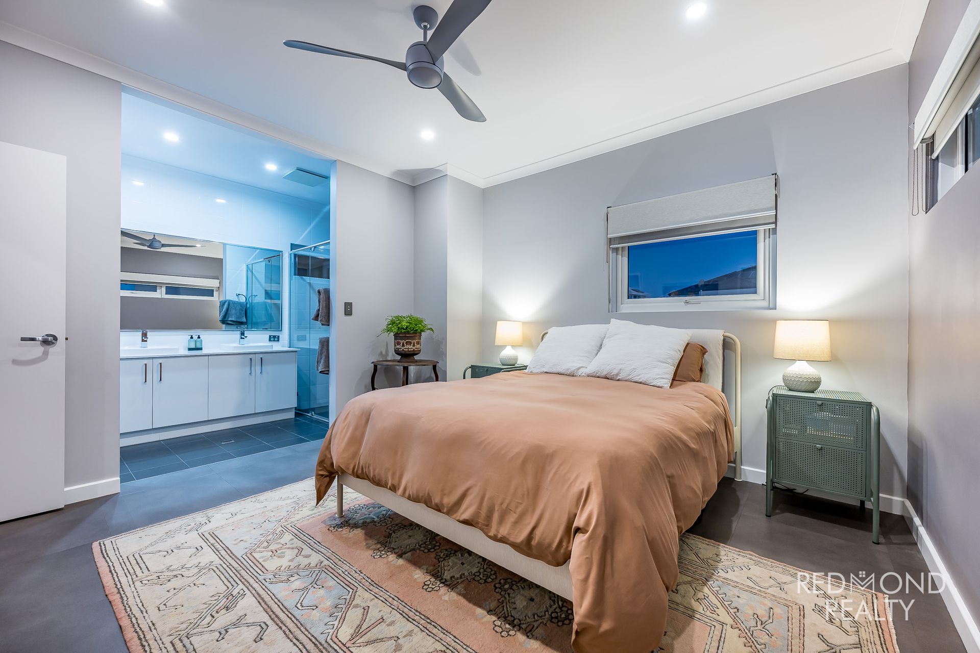 King-sized master suite with fitted walk-in robe and ceiling fan