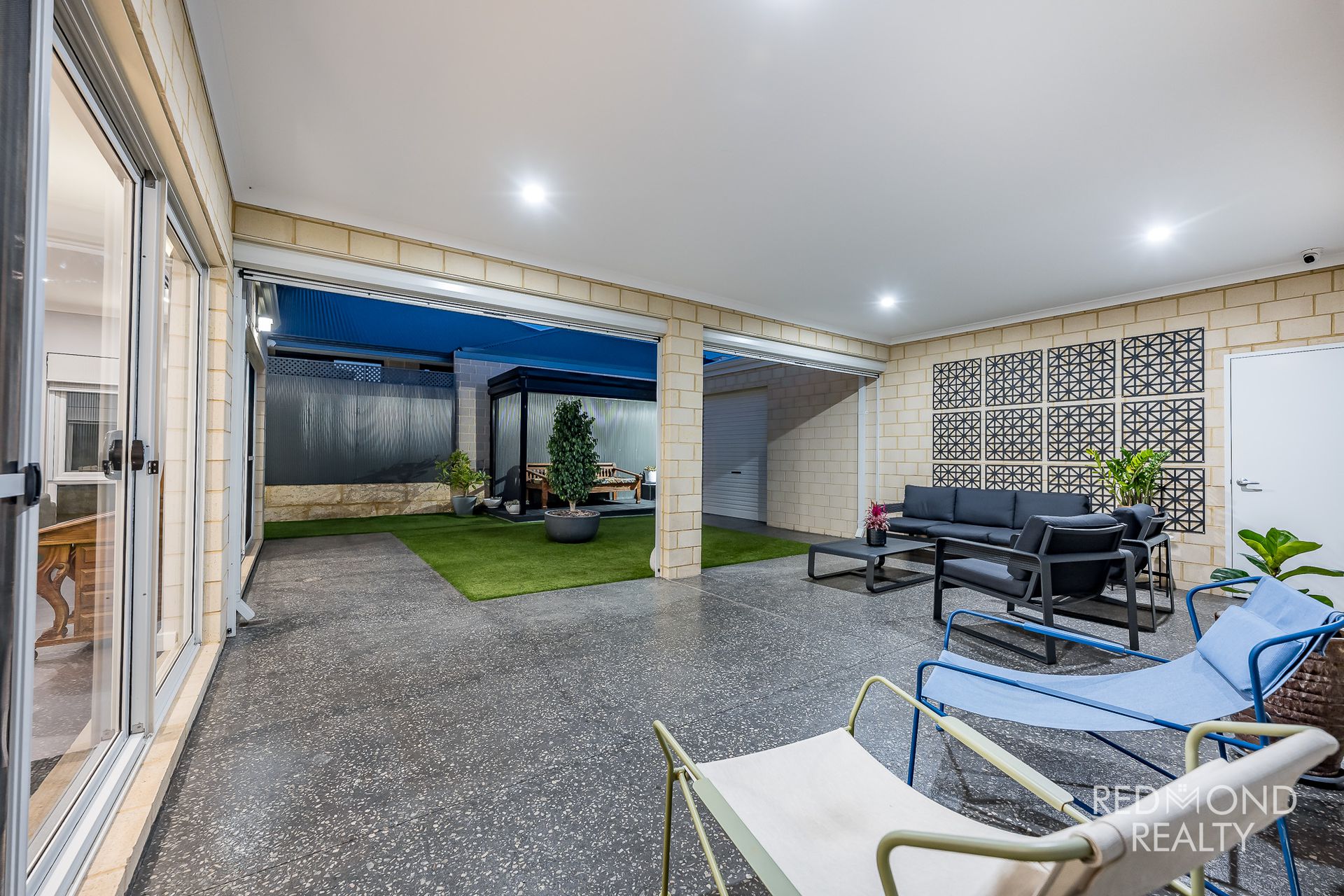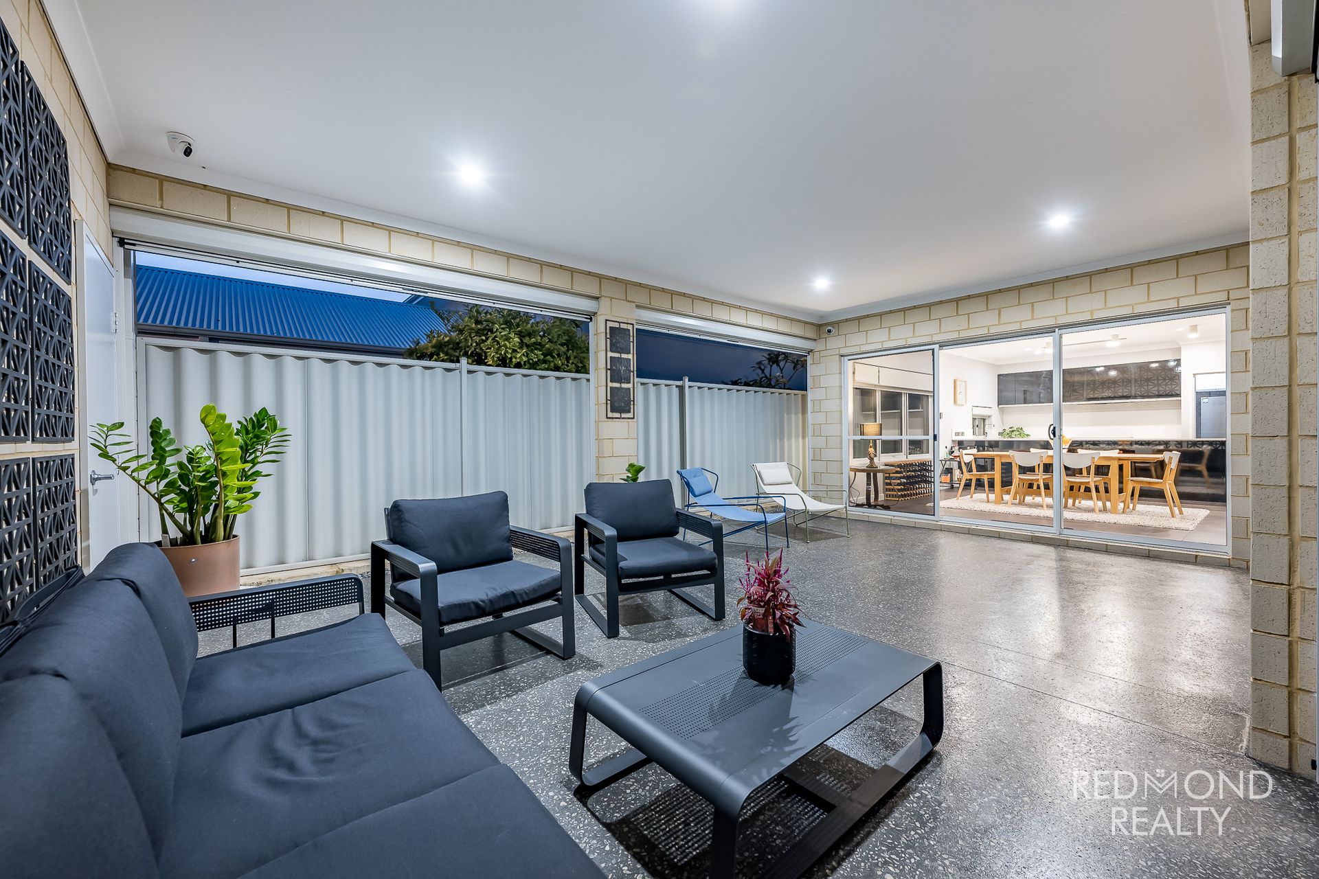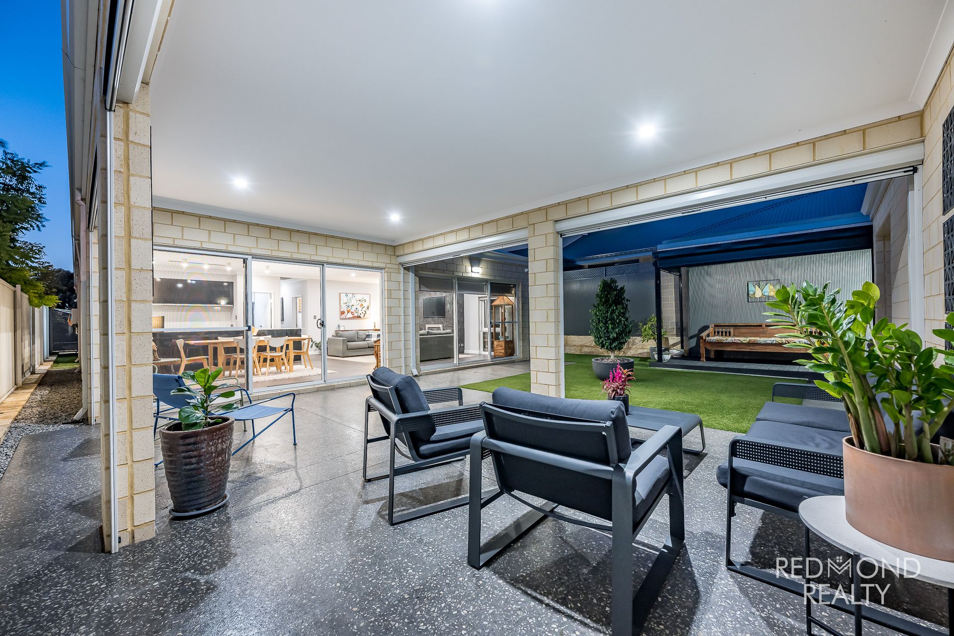 Expansive alfresco under the main roof with honed concrete flooring and all-weather blinds