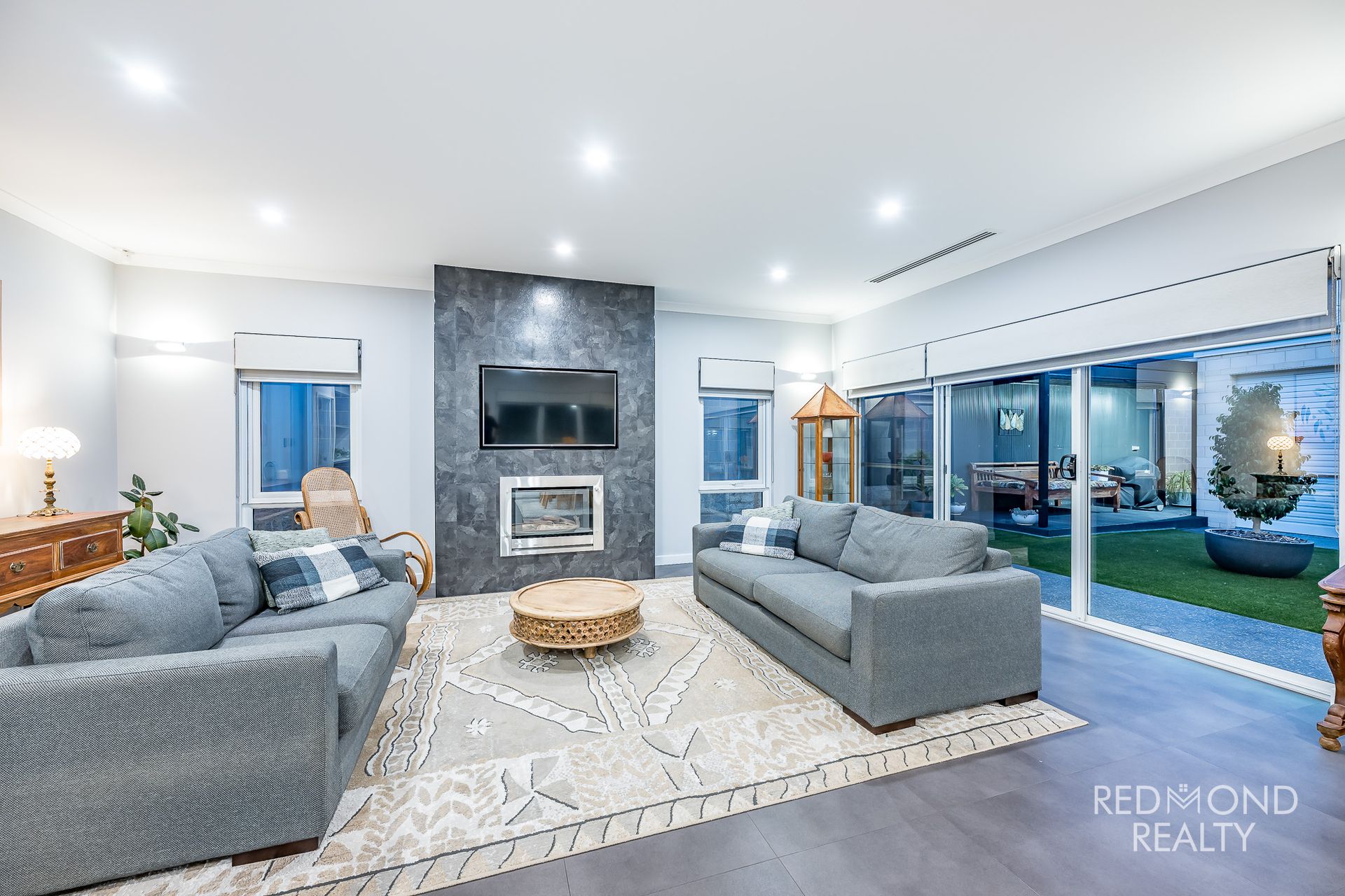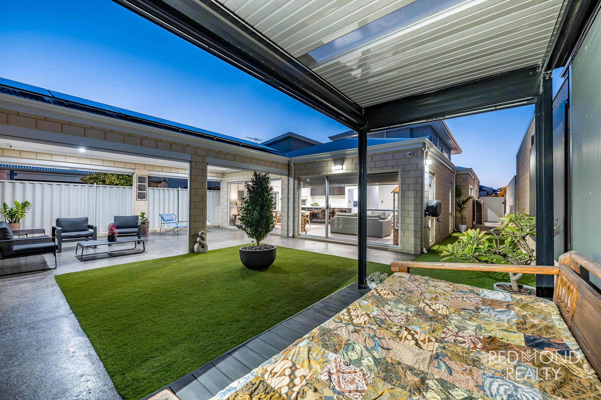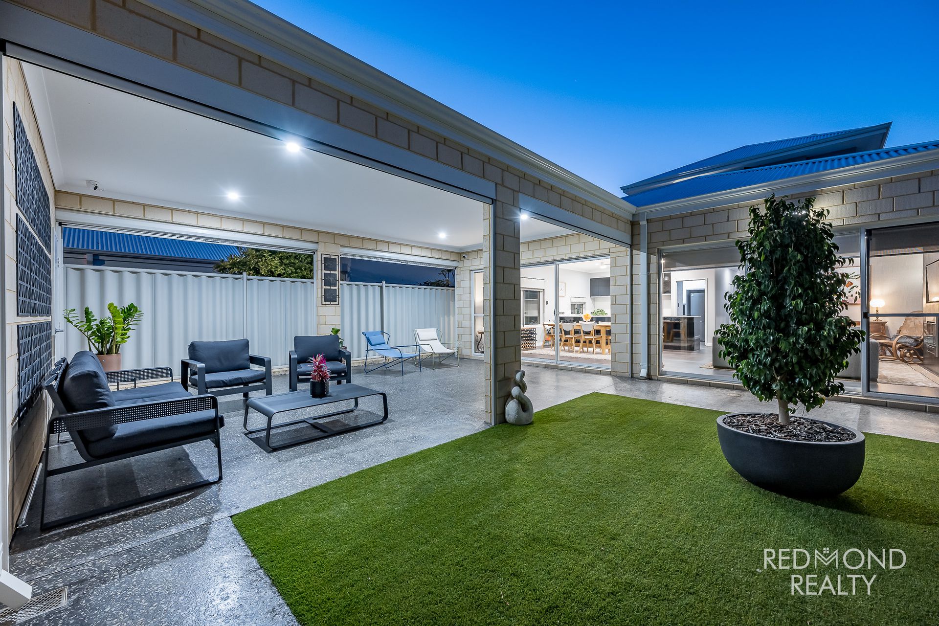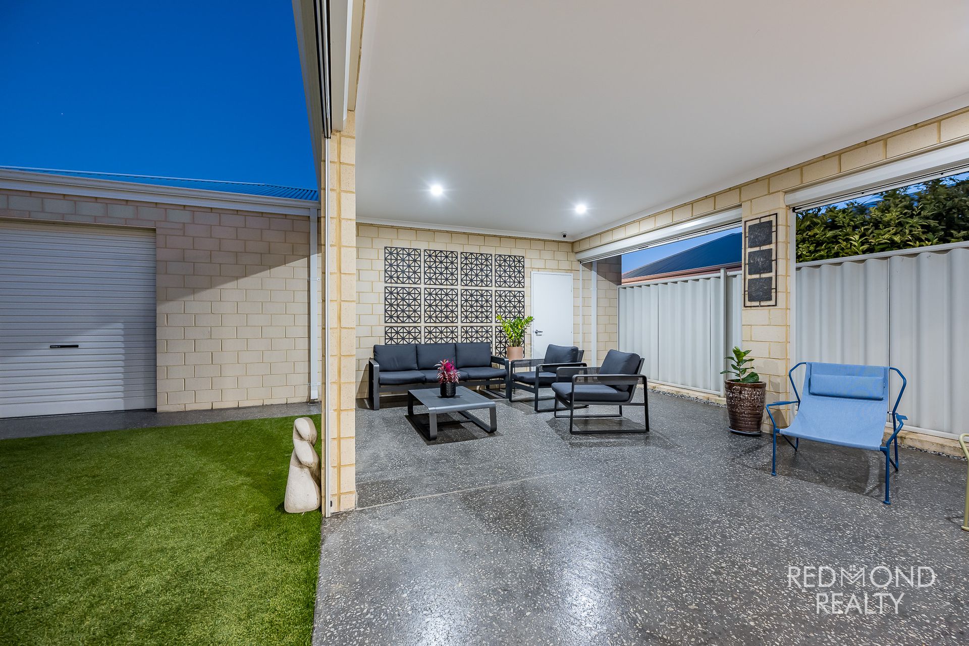 Expansive alfresco under the main roof with honed concrete flooring and all-weather blinds