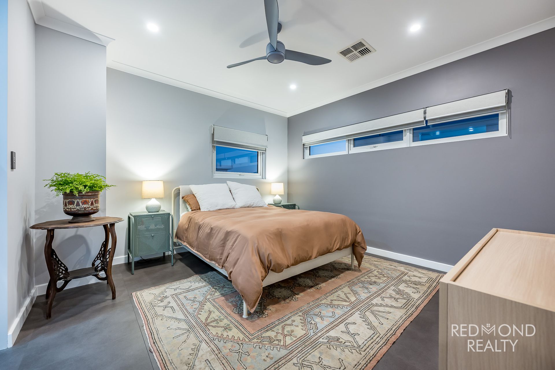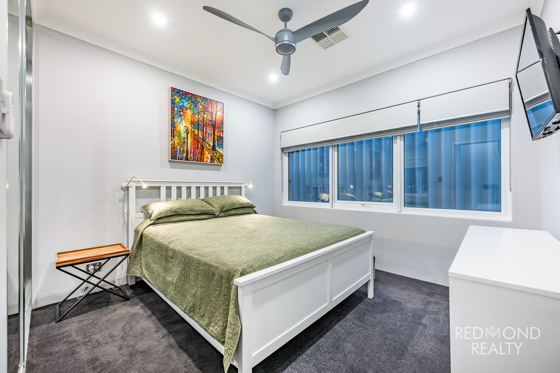 Bedroom with double mirrored robe and ceiling fan