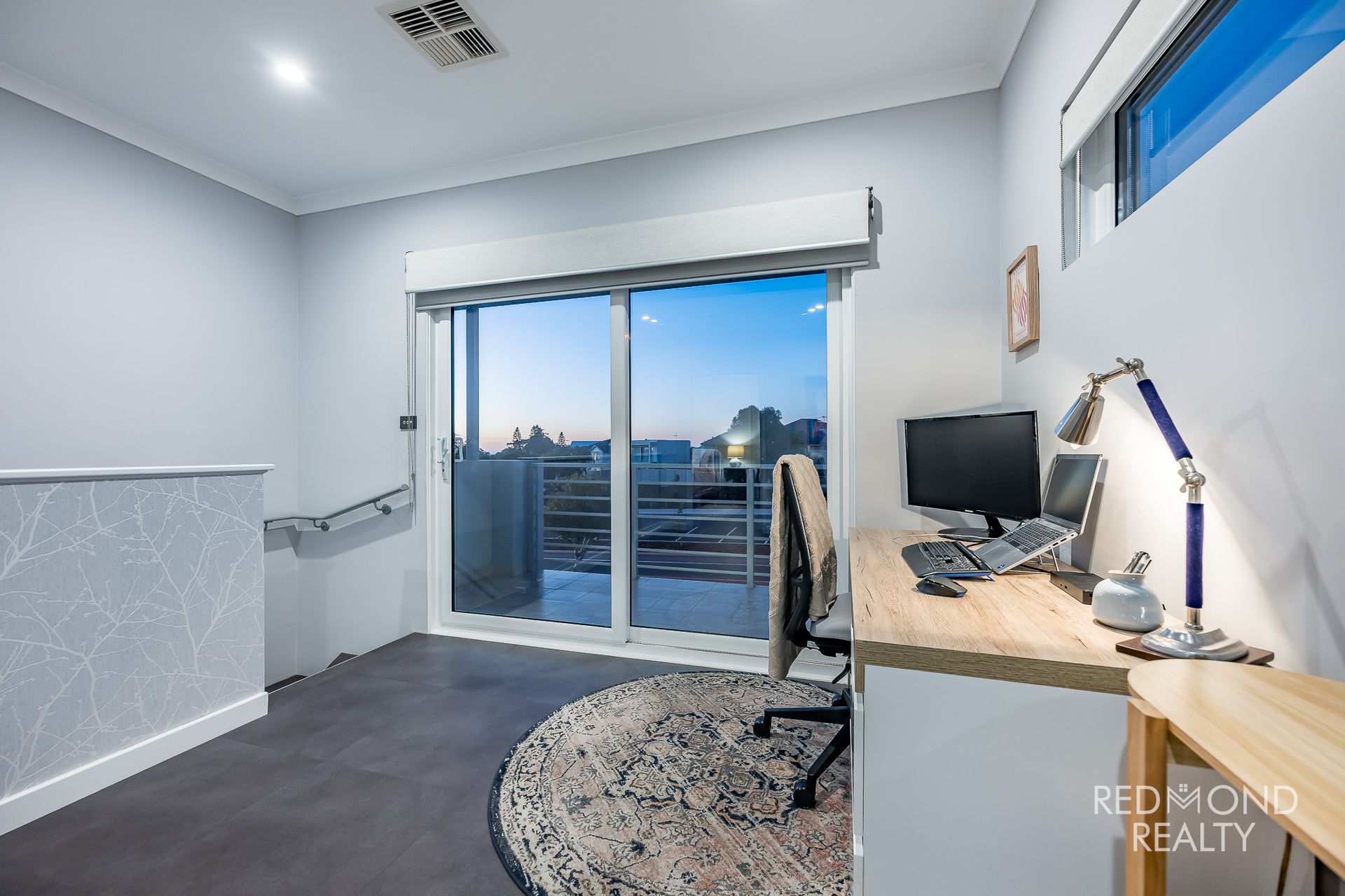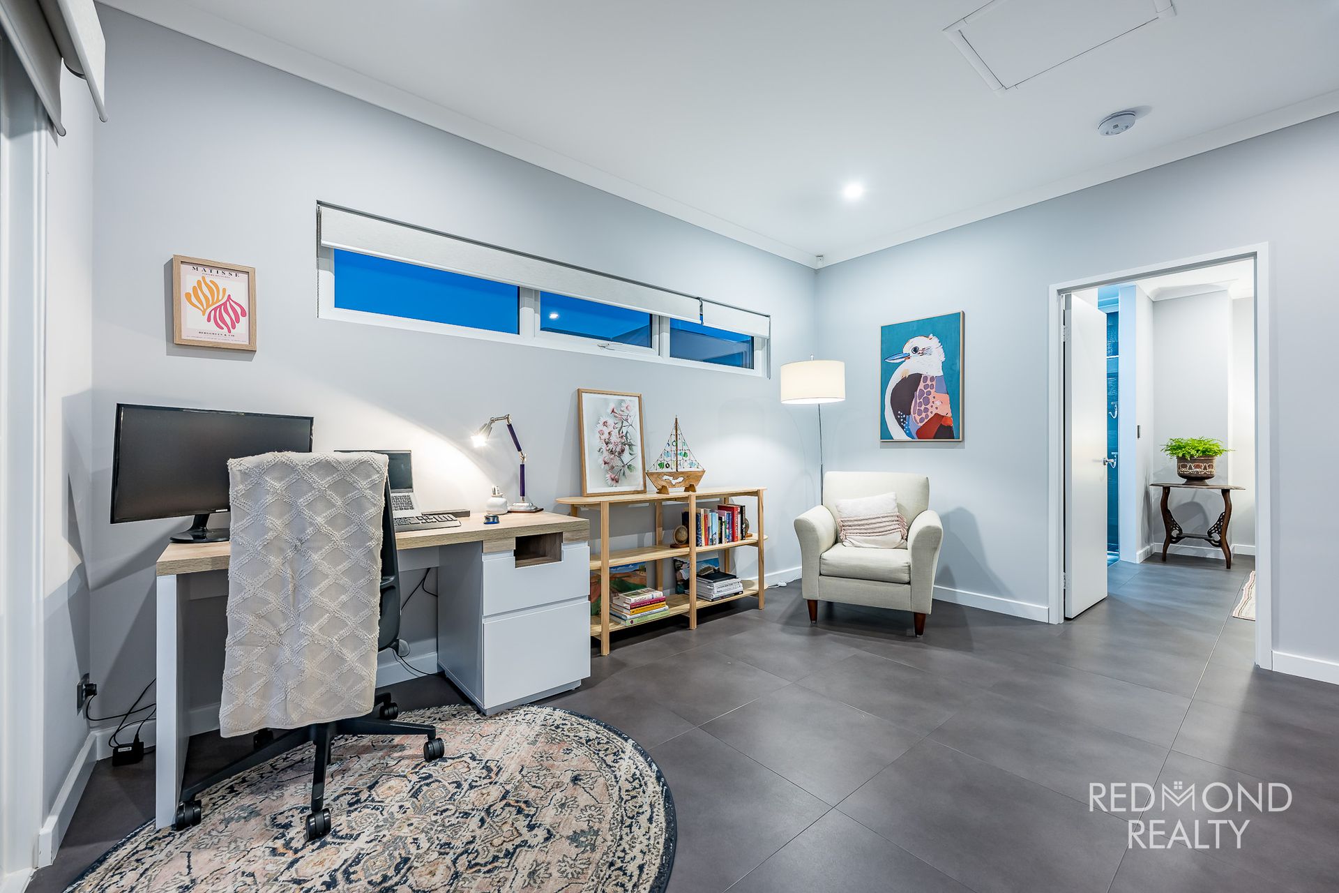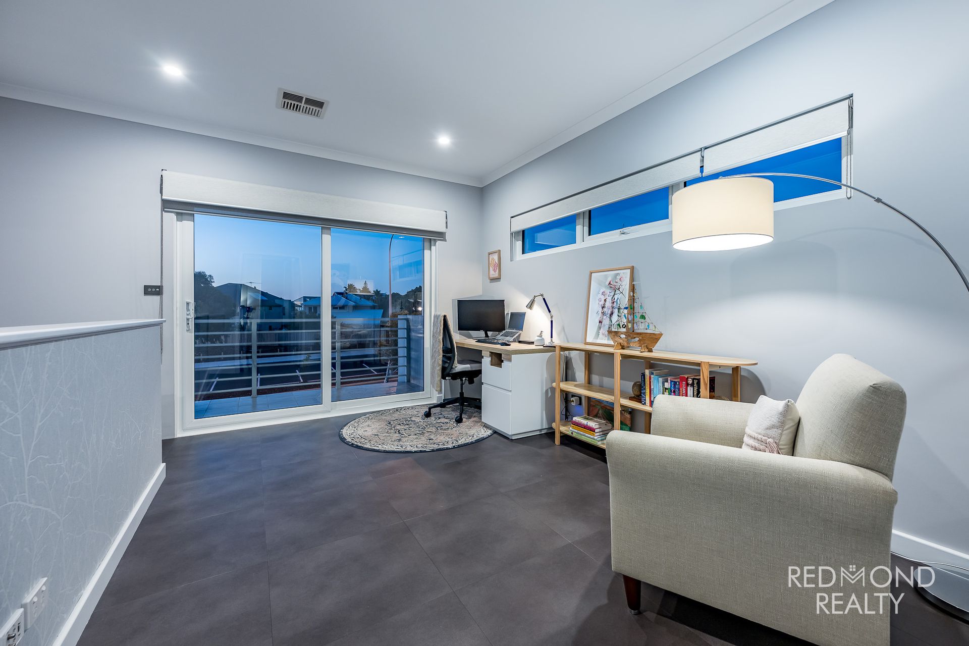 Private parents’ retreat/study with sliding doors to tiled balcony showcasing ocean views