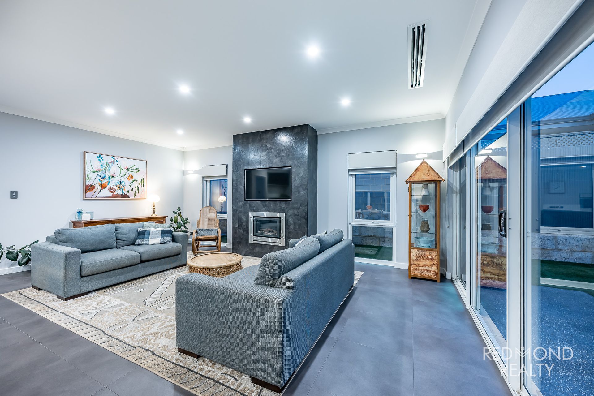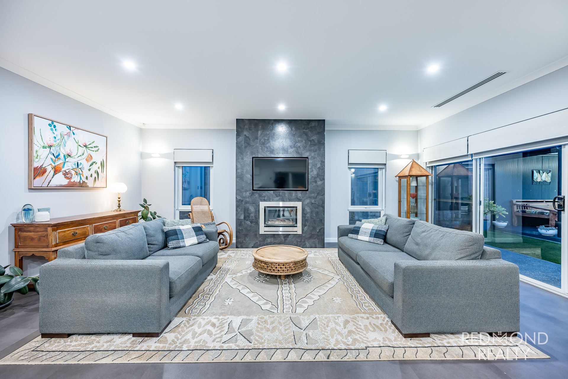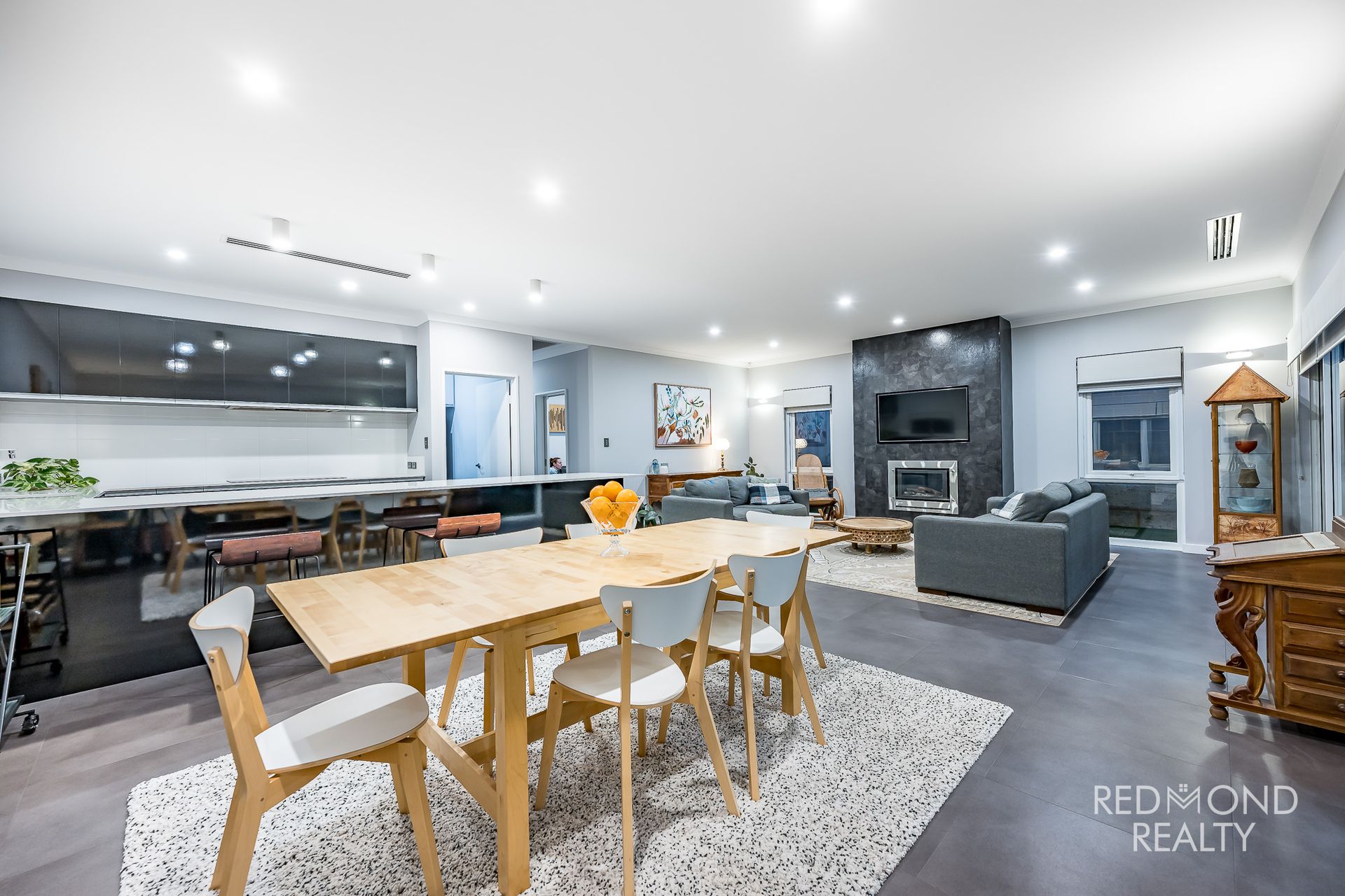 Open plan family living with gas fireplace and TV recess