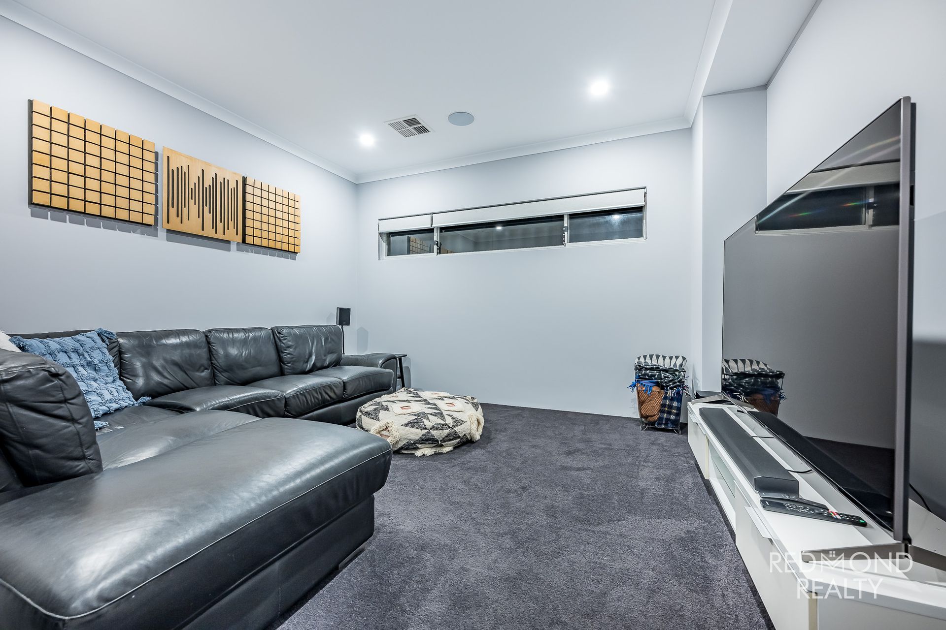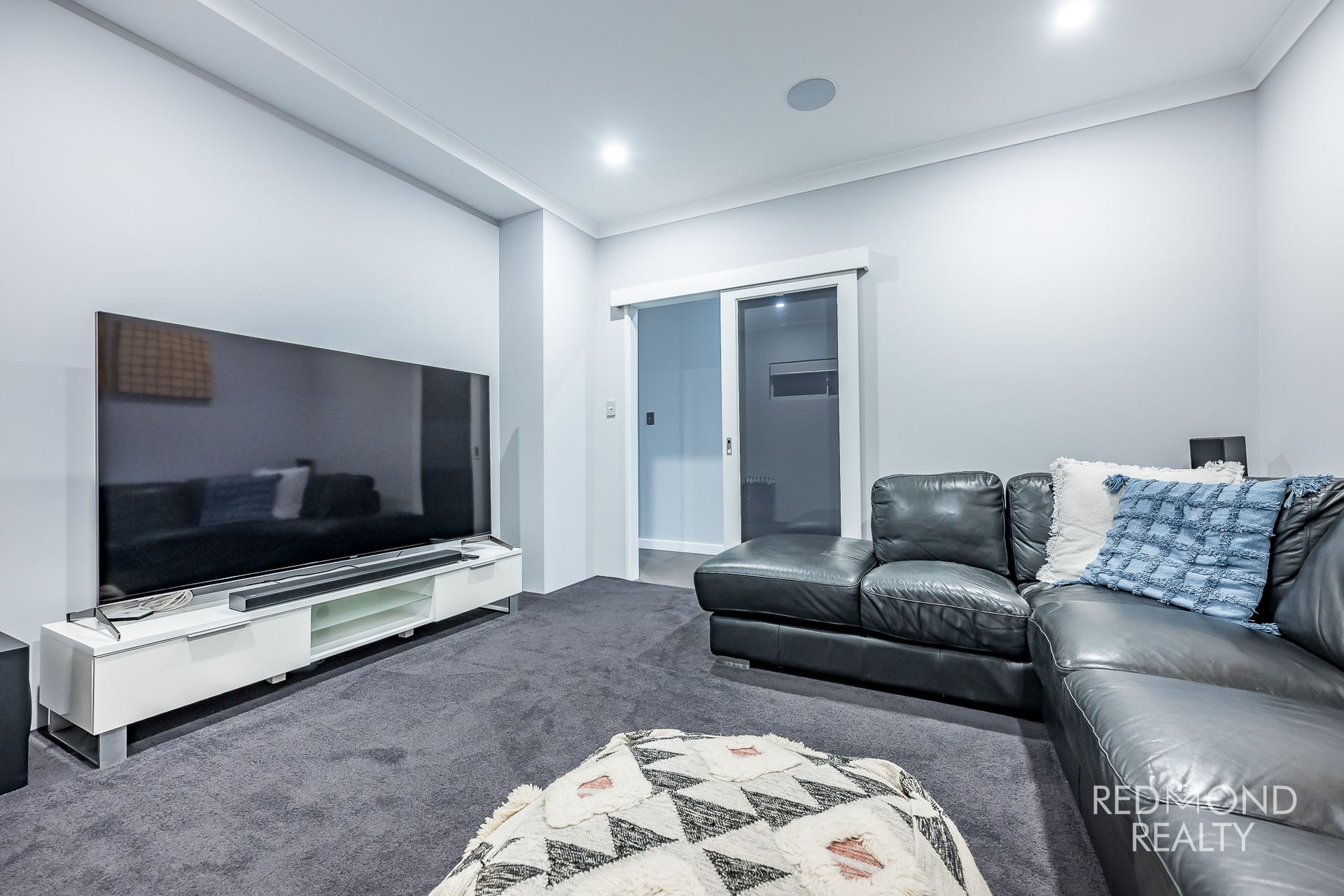 Dedicated theatre room with tinted glass sliding door and ceiling speakers