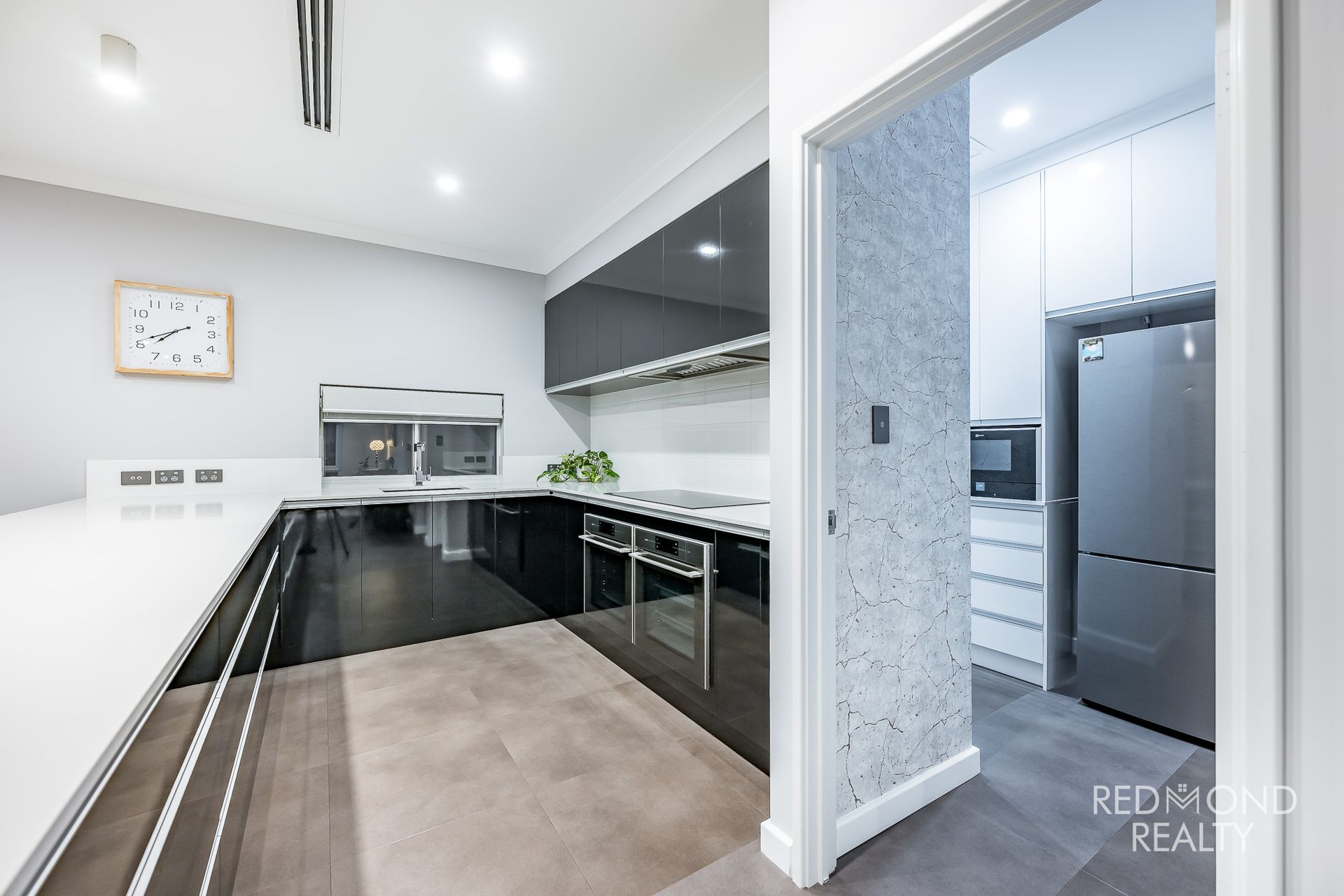 Separate scullery featuring double fridge recess, built-in Neff microwave, dishwasher, double sink, pantry and additional storage