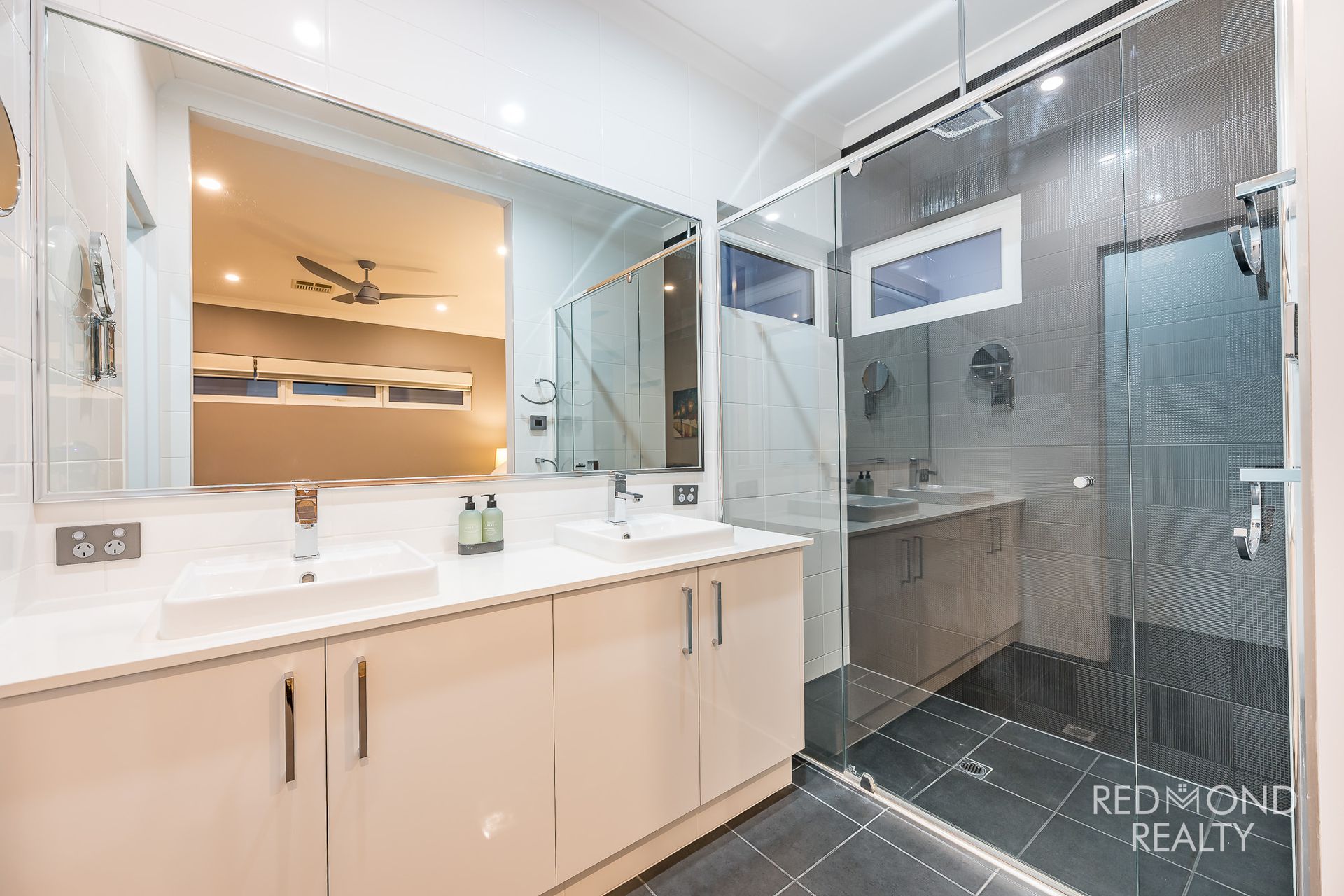 Luxury ensuite with double vanity, oversized shower with rain head and separate WC
