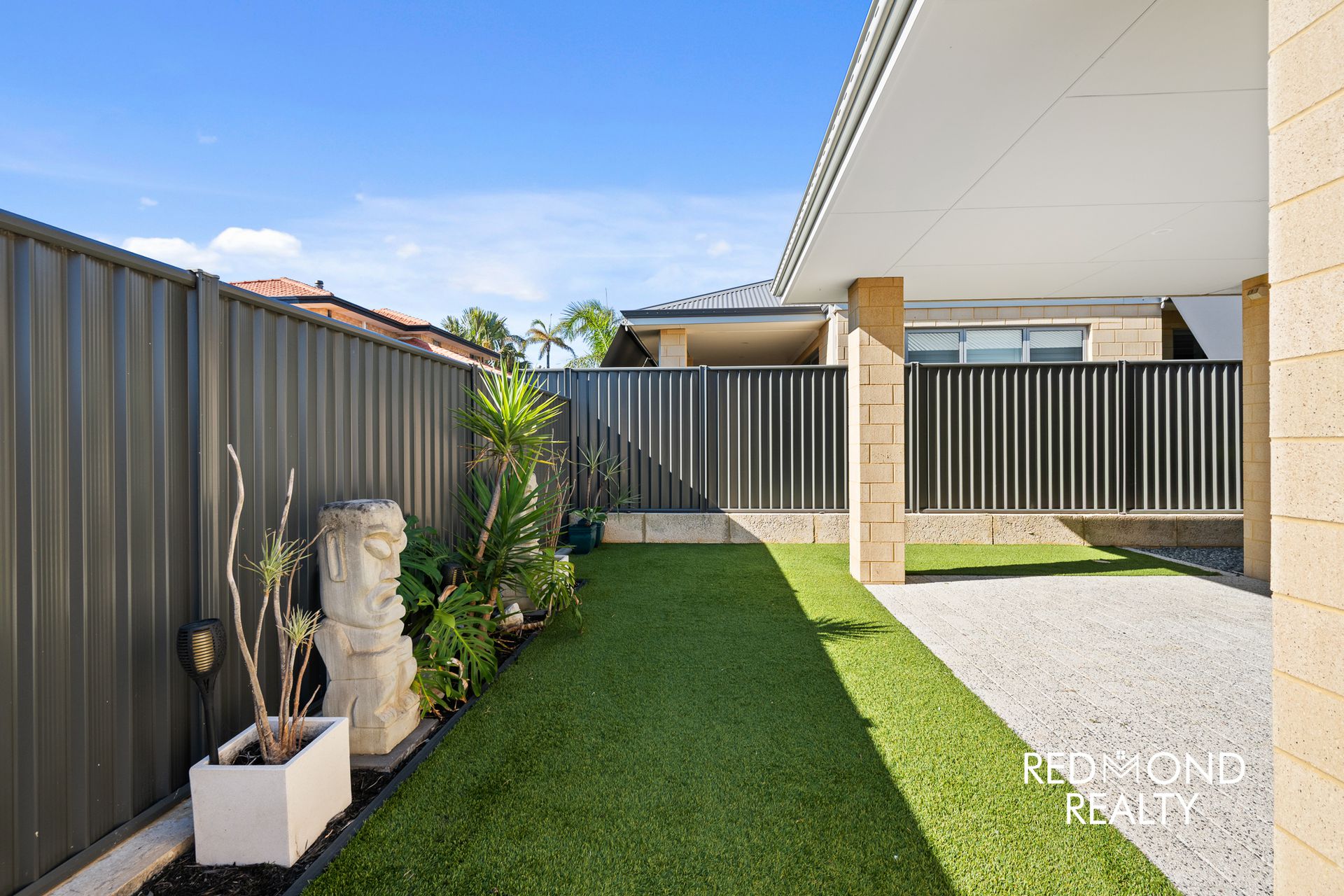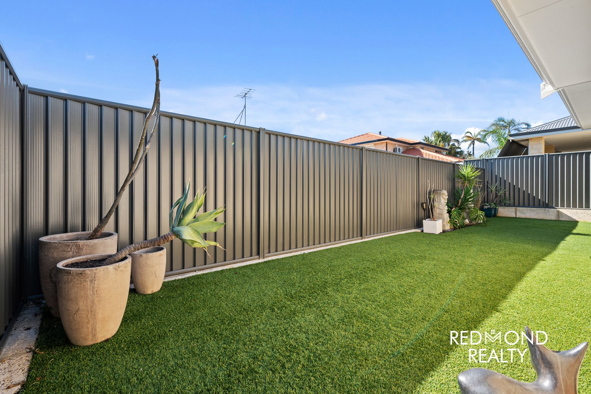 * Low-maintenance backyard with artificial lawn