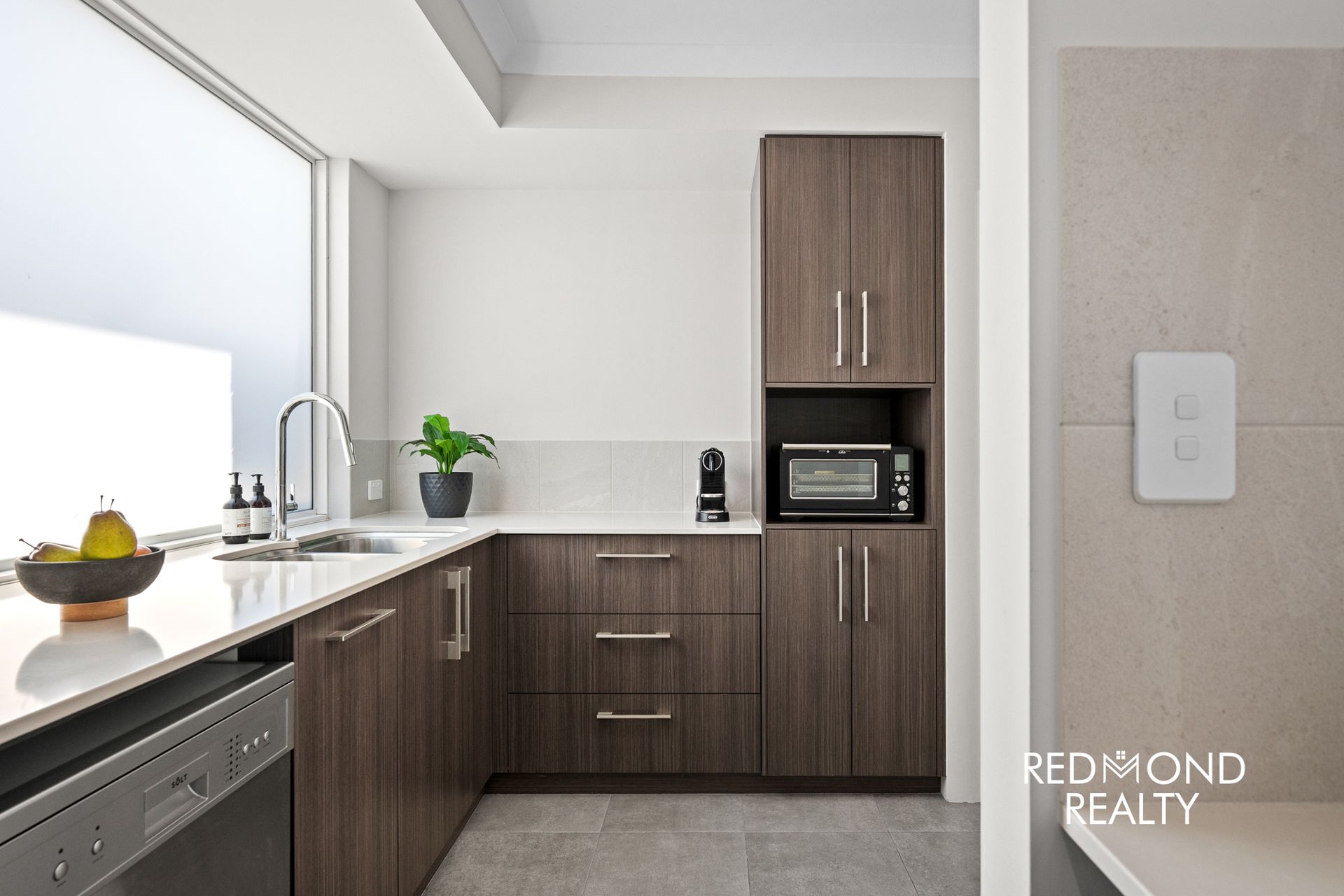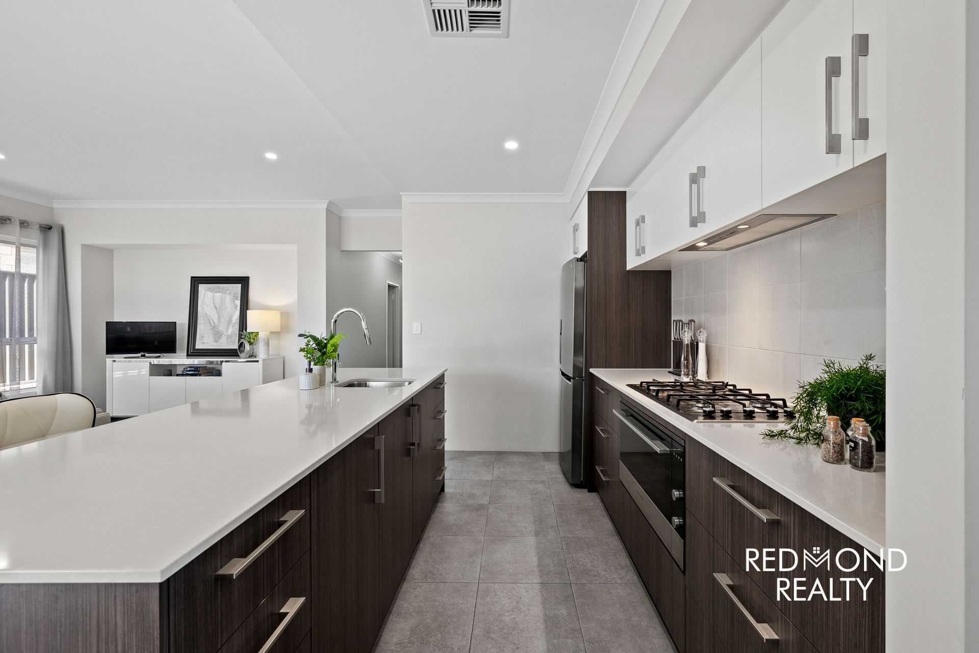 * Modern kitchen with stone benchtops and abundant storage