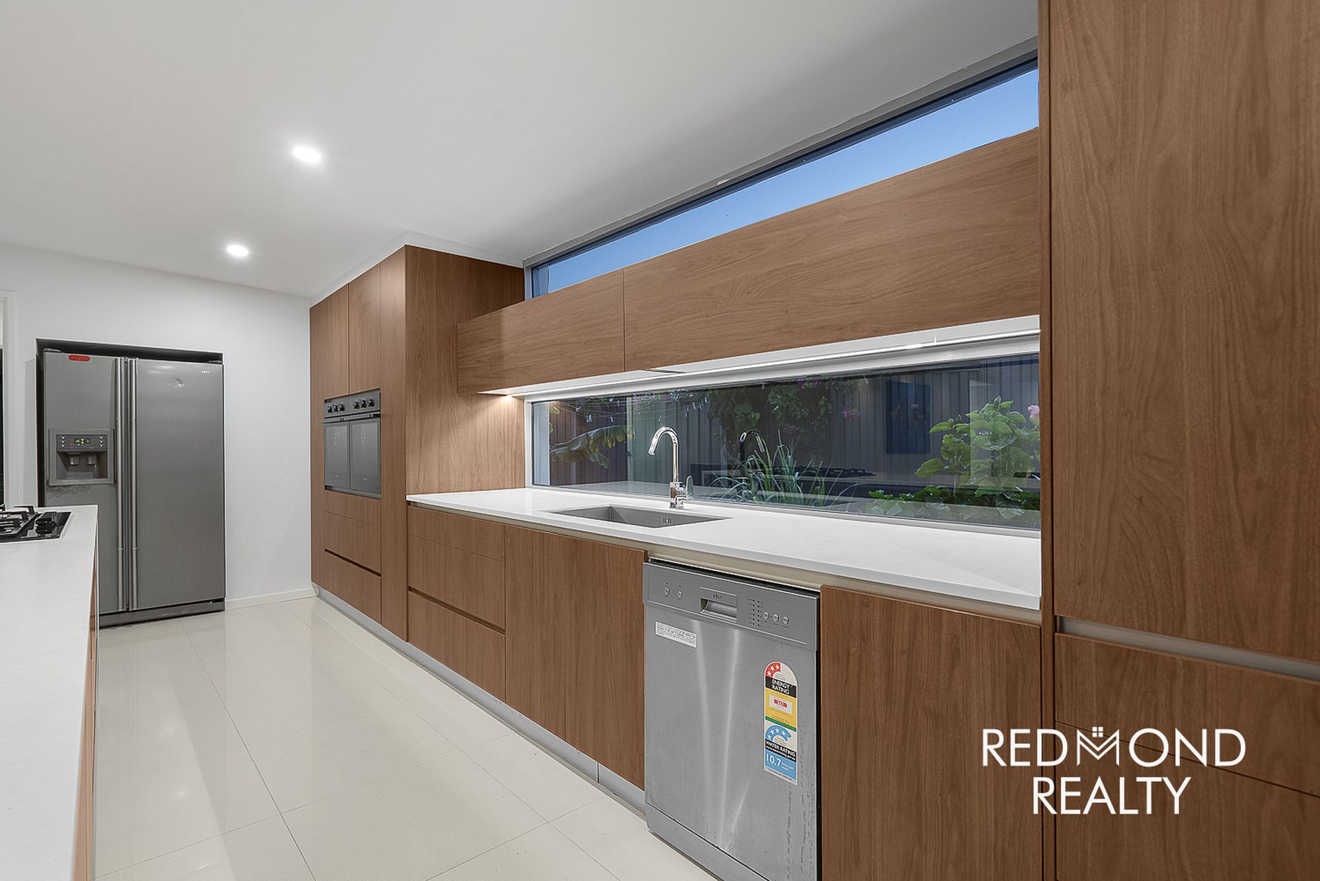 Chef’s dream kitchen showcasing modern finishes, abundant cupboard and storage space, and feature bay windows flooding the space with natural light. Complete with a luxurious oversized stone island bench, dual ovens, and brand-new appliances.