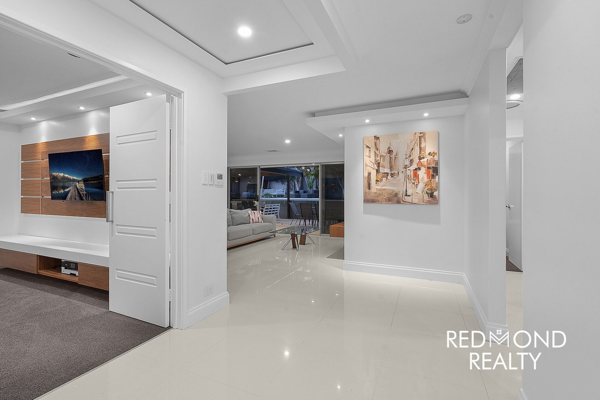 Step inside to discover a well-appointed interior featuring five generous bedrooms, a dedicated theatre room, and expansive open-plan living that seamlessly connects the heart of the home. The chef’s kitchen is a standout, boasting modern finishes and new appliances, perfectly suited for both everyday living and hosting. Neutral tones throughout provide a fresh, timeless aesthetic, while the travertine-tiled bathrooms add a touch of luxury.